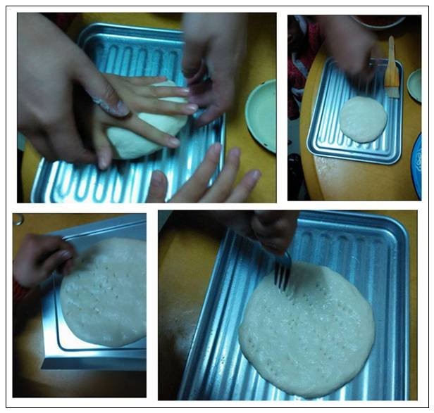 3. 然后开始煮酱料,先放点黄油在小锅里,下洋葱粒,番茄,番茄酱,鸡粉,盐适量炒香,这时候全屋都觉得香气扑鼻,肯定很有滋味啊。 4.此时,把发酵好的面粉团,适量分成份数,取一份用擀成中间薄边缘厚的面饼,用叉子在面饼上面扎些小孔。大宝就好喜欢帮忙了,一说有用得到她的地方,马上就拿起叉,在面饼上扎来扎去,然后美滋滋的说,这是她做的彼萨皮,等会非常的香口。这样做做好皮了。