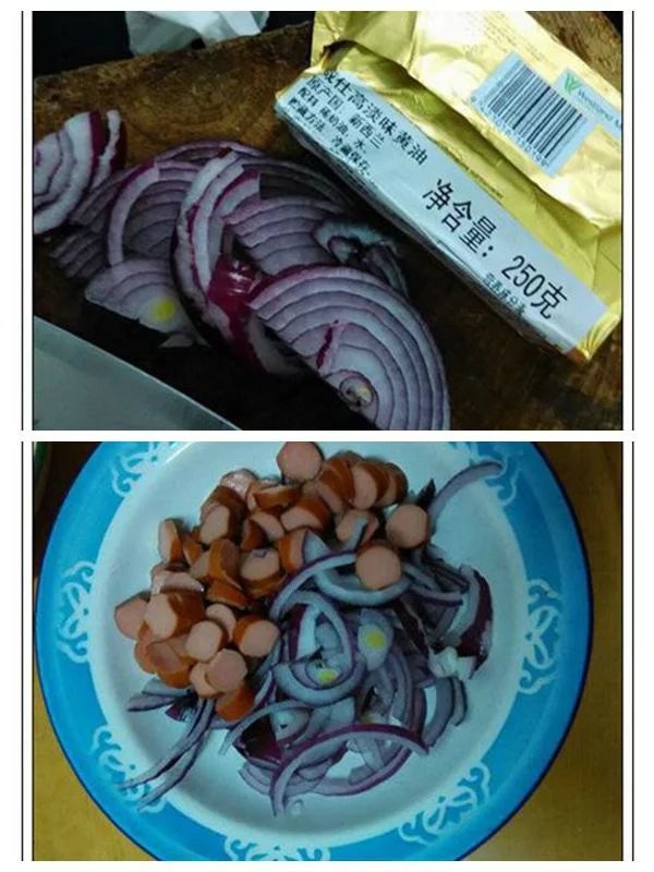 2. 这时候,可以整陷料了。洗净洋葱,一切切丝,小部分切粒,番茄切丁,香肠切粒。