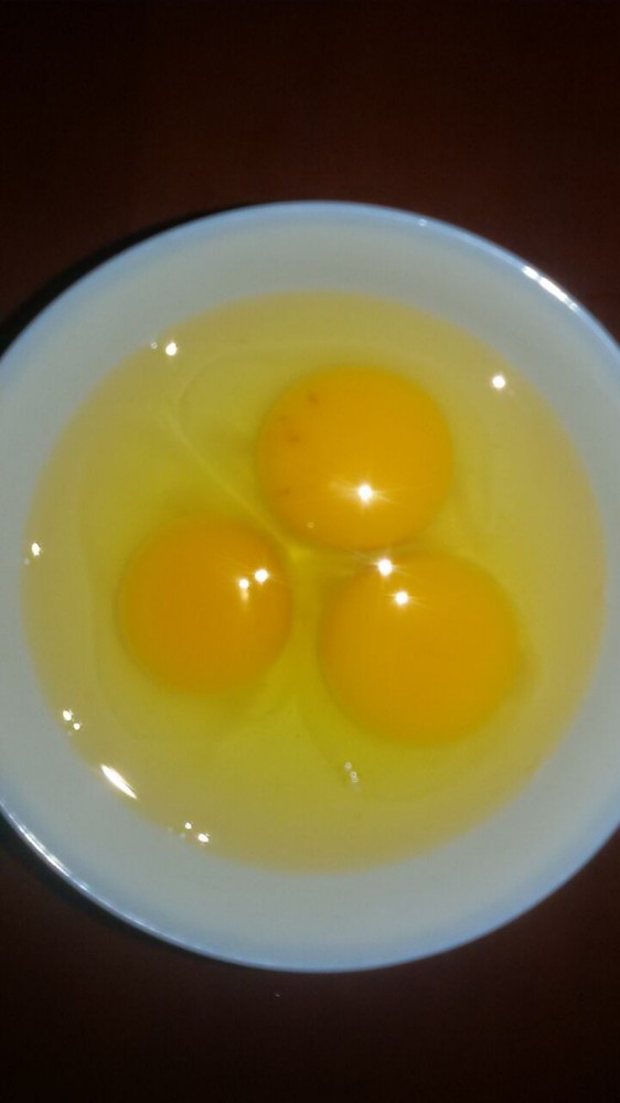 大家看得出这些鸡蛋有什么不同吗?对,它们是土鸡蛋,我们从乡下捎回来的。大家细看的话,会发现有几只鸡蛋是不同的,它们一头大,一头小,尖尖的,就像是导弹的样子。本以为打出来的蛋黄是尖尖的,想不到打出来的鸡蛋同样是圆的。