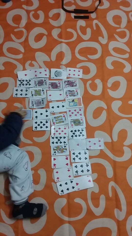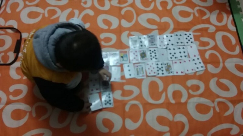 虽然小家伙用扑克牌排队时是没有规律的,是随意排列的那种,但人家还是玩得很开心的。看来我也不必太早教他如何打扑克牌了,只需要适当引导一下,然后让他自己按照自己的想法来玩即可。