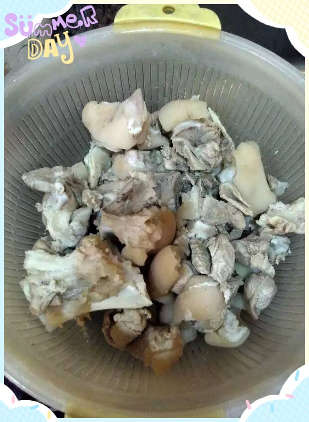 第一,先把猪脚斩好,这个是买的时候已经斩好了,我们刀工没那么厉害哈。冲洗干净后,煮一锅热水,水开后放进去焯水,10分钟左右就行了,让退去猪气味。