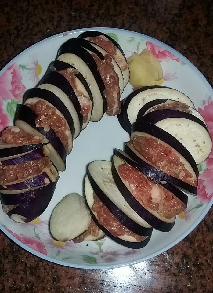 因为这肉末酿茄子蛮好吃的,所以跟大家介绍一下其做法。 材料准备: 茄子一条、猪肉末适量(调味)、生姜三片、葱花适量 步骤: 1、 茄子洗净,去头尾,然后切片(两片为一组,中间不切断),备用; 2、 把调好味的猪肉末一一塞到茄子片中间,装盘备用; 3、 调生粉水:生粉、食盐、酱油、蚝油和适量的水调匀,备用; 4、 锅烧热,加入适量的花生油,然后下生姜片爆香,然后关小火,再把酿好的茄子片放到锅里,然后加入调好的生粉水大火煮,水煮开后改中火继续煮; 5、 待汤汁差不多收干时,往上面撒上葱花即可关火出锅食用。