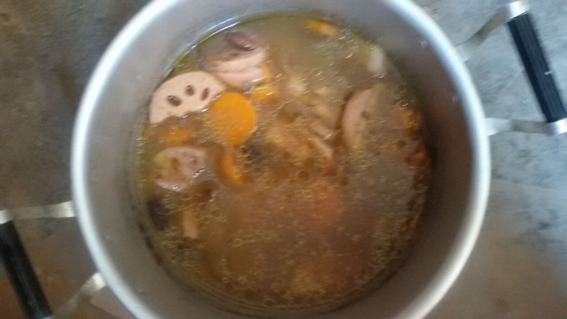 因为老妈知道小不点特别的喜欢喝汤,所以她次日又煲了一锅老火靓汤了。当然,这汤不是前一天那种汤,而是莲藕胡萝卜薏米鸡汤,看到材料这么的丰富,就知道这汤是多么的鲜美了。呵呵……记得老妈以前煲汤时可是很单调的,就习惯用猪骨来煲的,其他的配料都极少给的,想不到她现在的煲汤方式有点像我了,煲汤的时候都喜欢往里面多加些材料,虽然有点杂,但煲出来的汤可不是一般的好喝啊,所以我们都很喜欢喝。