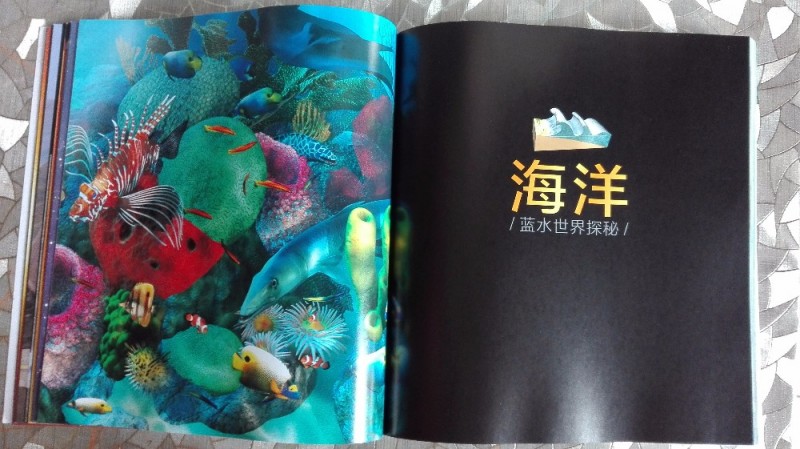 介绍完大致内容,来说说我的心得. 当我第一眼看到这书封面时,第一感觉这书很专业,一下子就让人感受到这个科学世界的无限魅力.一页页的翻读,仿佛自己身在浩翰无比的宇宙中,3D视效场景又让我仿佛在看科幻大片.让我对太空的认识更深入全面的了解,跟孩子讲解起来也容易得多了.书本介绍得很详细.不过孩子毕竟还小对这一部分的热爱远远不及海洋部分. 像曾兴宁教授所说:孩子对水的亲密感与生俱来,他们喜欢水,喜欢海,喜欢海洋生命的灵动. 的确,当我们看到海洋部分,看到五彩缤纷的海底世界时,孩子们大叫了起来:"哗!好漂亮啊"每翻开一页都能深深的吸引着我的孩子,书本介绍得真的是非常非常的详细有趣,看下图你也想不到吧.