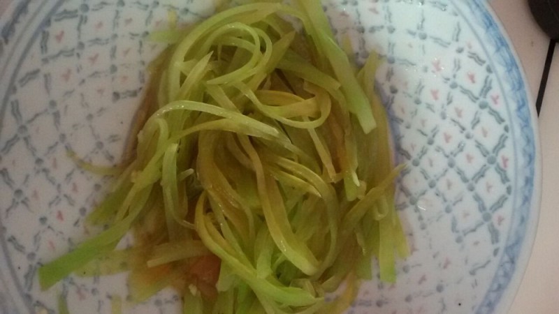 大家看得出这是什么吗?话说未吃这菜之前,我还真不知道它是莴苣,毕竟我们平时吃它的时候一般习惯切片炒,想不到朋友却细心地把莴苣切成丝,而且是凉拌的,所以吃起来又脆又爽口,平时不太喜欢吃莴苣的小不点竟然也很喜欢吃。看到小家伙吃得这么开心,加上莴苣挺营养的,所以我就向朋友讨教这菜的做法,打算以后学着给孩子做。
