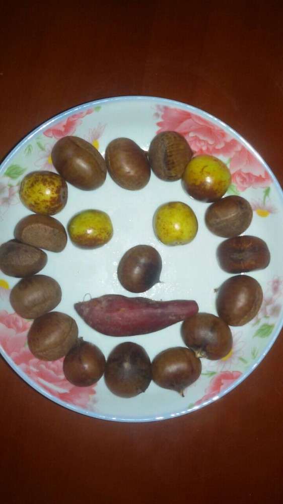 盘子里的笑脸是由煮好的栗子、红薯和红枣组成的,是由小不点自己弄的,看着还可以吧。个人觉得栗子煮之前不切开来煮比较好吃,煮熟后直接用嘴巴咬一口栗子就会开口的,然后一分为二。因为小不点不太懂吃这样的栗子,所以我就把把栗子里面的栗子肉挤出来给孩子配着酸奶吃,这样小家伙也就不会吃得到处都是栗子肉了。