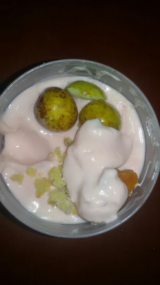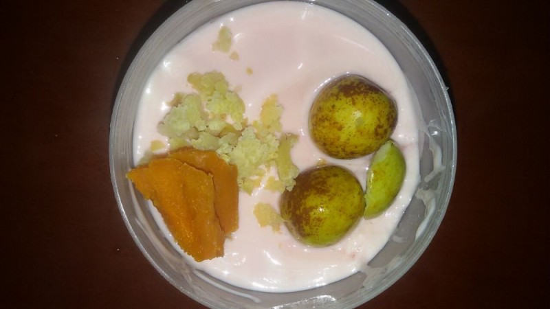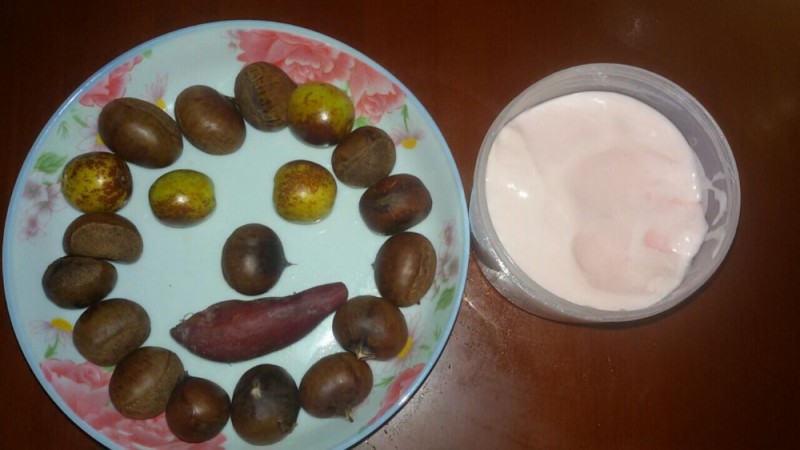因为没有专门搭配酸奶的食材,家里也没有漂亮的杯子,所以只好就地取材,随意搭配了。大家看得出里面有什么吗?其实橙色的那个是甜而不腻的红薯,而淡黄色的那个是我用手捏出来的栗子肉。此外,还有又甜又脆的冬枣呢。虽然这样的搭配看起来怪怪的,估计也没多少人这样吃过,但小家伙还是蛮喜欢吃的。