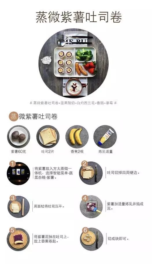 养成一个习惯,只需21天。坚持二字好写难做,就像我在小妞上小学伊始扬言坚持要给她每天做早餐,但是偶尔还是会犯懒,人的惰性是很可怕。一旦发作,便是连锁反应了,所以说坚持21天可能是容易,但长期坚持下来需要相当在的毅力。在21天的早餐打卡计划里,每天点开当日日期,便有一款方太独家定制的早餐食谱浮现在眼前。我对这些食谱特别感兴趣,觉得这样的早餐真是没有不爱的理由啊,哪怕是心中想着要瘦身千百遍,在这样的美食当前还是会忍不住勇往直前,并安慰自己吃饱吃完再减。 多种营养搭配的美食,让早餐充满期待也为开启一天的精气神加分。每天签到后,我便把这些食谱一一收藏起来备用。除去那些需要特殊工具来协助的,那些看似简单可行的早餐食谱则是我练手的首选目标。这不,我就选择了一款材料和做法都相当简单的——蒸微吐司卷。早餐是需要变着花样来做的,太过单一的早餐缺乏吸引人,乏味,只有不断尝鲜和尝试新的早餐食谱,这样才能更好地让孩子爱上吃早餐。 准备好材料:吐司面包片2片,紫薯1块、香蕉2根、原味炼乳、擀面杖。一切就绪后就可以开始制作了。按图索骥,有了材料和现成的食谱,一步一步按步骤来完成。 ![]() 做完,成就感满满!关键是孩子也喜欢吃!就是初次实践操作,在封口这边没注意预留空间,所以卷出来没有那么圆。 ![]() 早餐:稀饭+冬枣+奶黄包+蒸微紫薯吐司卷 ![]() 附方太早餐营养食谱,如果你也感兴趣,不妨动手做起来。