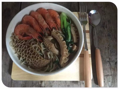 ![]() 11月27日|周日 美食随手记 在我们这边的美食店随处可见以牛肉为主打的小店充斥在大街小巷,也算是闽南风味的特色小吃之一了。牛肉羹、咸饭、牛肉面、牛杂汤等都是食客们喜欢的美食,平时去店里随便点一碗牛肉面要价也要10元以上了,还只是附少少的一点牛肉而已。妞爸的二姐夫就是一牛肉店的厨师,他有着一手烹饪的好厨艺。周六上他们家做客吃晚饭,宴请我们的便有一道他的拿手好菜——牛肚汤。妞爸也好这一口,对牛肉的菜肴情有独钟,这牛肚汤一喝就好几碗。所以吃过晚饭,二姐又打包了一大锅的牛肚汤让我们带回家。 中午,我和妞妞还有奶奶想吃稀饭。妞爸不爱吃,我便单独给他开小灶,选择了以这牛肚汤为食材,就着冰箱里的一点点面条,刚好够他一人份的量。面条是妞爷爷在菜市场买回来没煮完剩余的,类似于拉面品种。冰箱里还有一点小油菜,貌似是婆婆自己种植的?嫩嫩的用来下面条再合适不过了。白灼虾也是二姐昨晚打包给我们的,也顺带抓了几只一起煮。舀了一碗牛肚汤备用,因为要用来煮面,这汤头再加热后会有些咸,所以必须要加些开水来稀释冲淡一下。 ![]() 锅中加了一碗开水、倒入牛肚汤烧开后,下面条,牛肚本身是煮熟的了先捞在旁边备用,待面条煮熟了再下去加热就可以了。捞去浮沫,防止面条粘锅。等到面条煮开后,约七八成熟了,再依次加入牛肚、小油菜、白灼虾,大火煮熟后盖上锅盖稍微焖5分钟再出锅,考虑到牛肚汤本身也有加调味料了,因此不再另外放盐和油了。 ![]() ![]() ![]() 出锅后装进碗里摆一下造型,红的、绿的、黄的,让这牛肚面看上去还蛮好看的,也令人更加有食欲了。