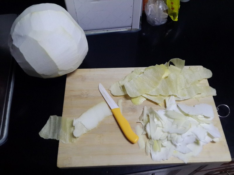 ![]() 很早的时候就想买蜂蜜柚子茶喝,可惜自己带妞出门太难了,尤其是冬天穿得厚,行动更不方便,抱她出门太累。在这件事情拖了很久以后,有天蹭车去沃尔玛,终于看到了心心念念的蜂蜜柚子茶,心里开心极了。看到有两种,都是韩国进口的,比较了半天,也没有发现有很大的区别。看看配料表,添加剂一个比一个多,有麦芽糖,柠檬酸,白砂糖,后面还有一堆…而且一瓶还要40,有点小贵吧!想起自己在微博上看到过人家一个柚子,不但做了柚子茶,还做了柚子皮糖,最后还做了了洗碗精,而且有视频,难度不大,还是自己做比较划算。 ![]() 材料需要冰糖,柚子,蜂蜜,水。婆婆搬走以后,家里空了什么都需要现买,趁着老公周末休息的时候把需要的东西都采购齐全了,接下来就是万事俱备就等自己上场了。家有一小,真是操心到老,尤其是遇到我家这种破坏王,跟屁虫,一刻都不能离开妈妈的孩子,我只能等她睡着的时候再做。晚上的时候把妞哄睡了,溜到厨房用骨瓷刀把柚子上的皮都取下来,里面的白瓤比较苦,尽量多去些。快做完的时候,妞哭着醒了,自己只能冲回卧室继续哄睡,等她再次睡着以后,把剩下的搞定以后放到冰箱里,准备第二天接着来,这就是家有一小的麻烦,做想做的事情好难! ![]() ![]() ![]() 第二天中午,自己提前找好冰糖,把柚子的果肉掰碎,柚子皮切成细丝,所有的东西准备齐全就等妞睡觉了。妞睡着以后,就开始自制蜂蜜柚子茶了。找个不粘锅最好,其他的锅容易糊得时刻看着,不粘锅就不用,只要不溢就行了。锅里放入冰糖,水,柚子皮,开火煮沸,等到柚子皮变透明以后,放入事先准备好的柚子果肉,搅拌均匀,小火熬,大概一个小时左右,直到水分基本熬干,变得粘稠就可以了。热的时候是不可以放入蜂蜜的,这样会破坏蜂蜜的营养。放凉以后装到瓶子里,倒入适量的蜂蜜,搅拌均匀,蜂蜜柚子茶就做好了。放到冰箱里,什么时候想吃,挖一勺,温水冲着喝,很香甜的。 ![]() 老公尝了以后,说有些苦涩,我喝着还可以。后来在网上查了半天,有的说柚子皮提前煮十分钟可以去苦味的,下次可以试试。还有就是煮的时候,锅里千万别放太多的水,要不一个小时也熬不完的。