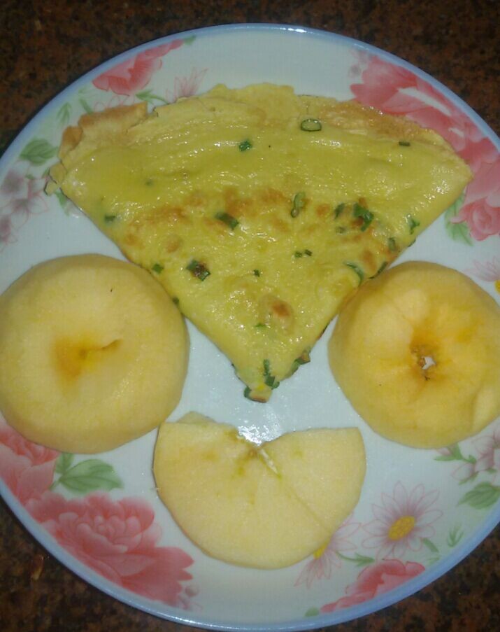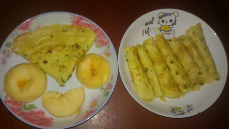 后来想到单纯吃煎饼可能会有点腻,加上早餐时最好吃点水果,所以我就专门削了只苹果放一起了。本来苹果不是这么切的,但由于小不点不喜欢我平时的切法,所以我就略为改变了一下,结果就切成这样了,没什么美感,所以也就将就一下看了。