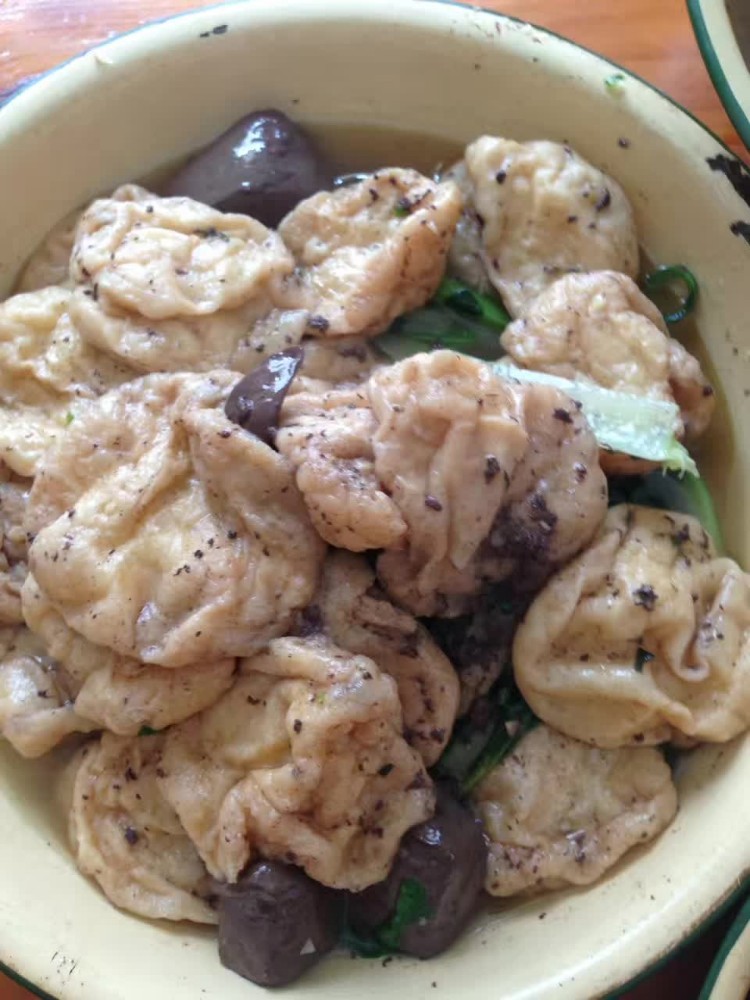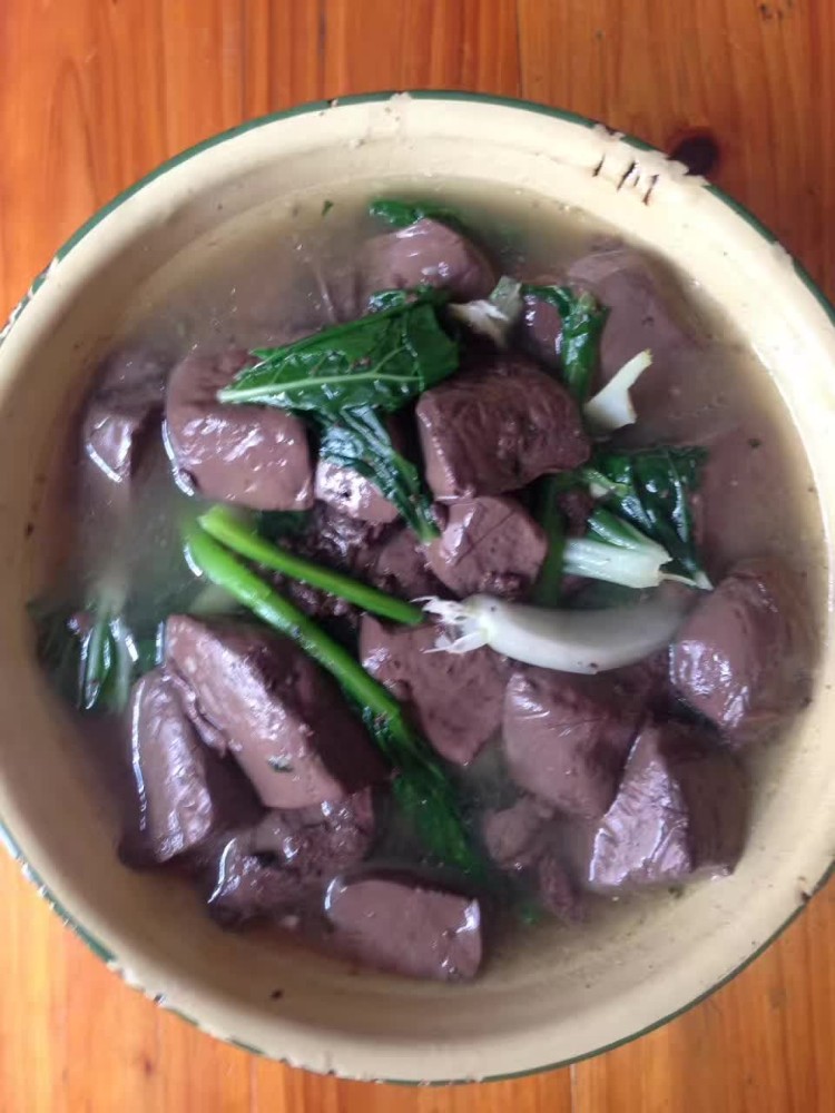 下面这个是青菜鸭血汤,我们乡下的特色菜。一般来讲,如果家里宰鸭,我们都会取鸭血来煮蔬菜汤的。一是利用青菜来吸取煮鸭肉的水;二是鸭血不但富含多种人体所需要的微量元素,含铁量丰富,而且鸭血还有”清道夫“之称,可以通过人体排泄把有害物质带出体外;三是鸭血本身的味道也是非常鲜美和滑嫩的,我们都是很喜欢吃的。