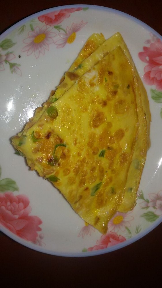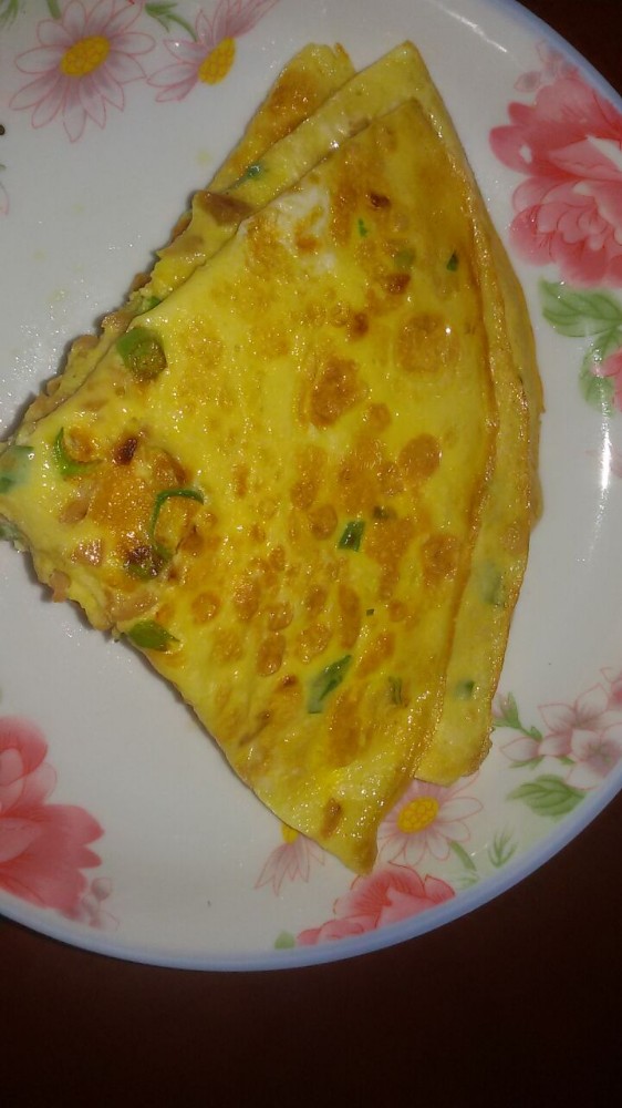 看,这就是宝爸那天新创作的”萝卜干煎饼“了,煎饼看上去卖相还挺不错的,油亮油亮的,一副很有食欲的样子。我尝了一块,感觉口感挺不错的,而且很开胃,比我做的好吃一些香一些,或许是因为鸡蛋多放一些和火候的缘故吧。