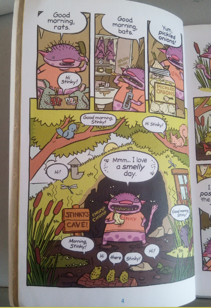 拿这本《臭臭找朋友》来说,这一本是第三级的一本,里面的故事很有趣味性。臭臭他喜欢咸菜和负鼠,他遇到了 一个喜欢洗澡和吃苹果的小男孩,他是要把小男孩子赶出去,还是要与新朋友分享他的臭沼泽呢?一起去书中看看吧。