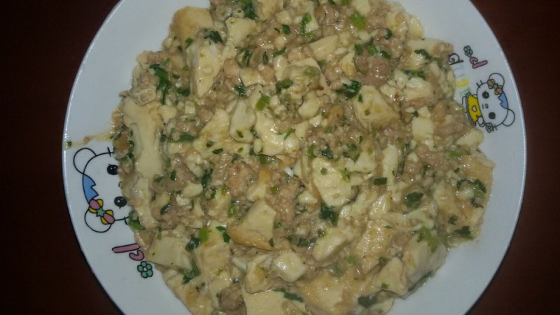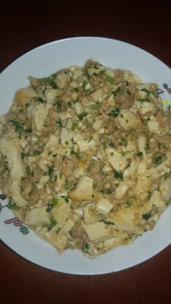 看,这就是俺做的肉末豆腐了,看着还可以吧?不过,这次因为盐放少了,所以吃起来不是很入味的样子。其实,我个人觉得做豆腐的时候最好加些韭菜进去,但由于小不点有点感冒的样子(鼻塞),所以我就不在里面加韭菜,而改为加香菜了。或许有些人觉得加些葱花到肉末豆腐里面更好,可我听说煮豆腐的时候最好别放葱,所以我就不敢放,而心安理得的放香菜了。其实,放香菜也是不错的,不但能提味,刺激人的食欲,而且还有驱风解毒,疏散风寒的作用。