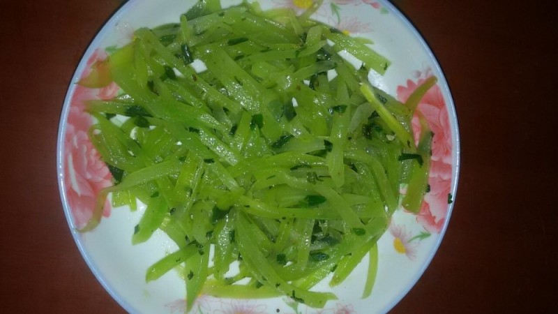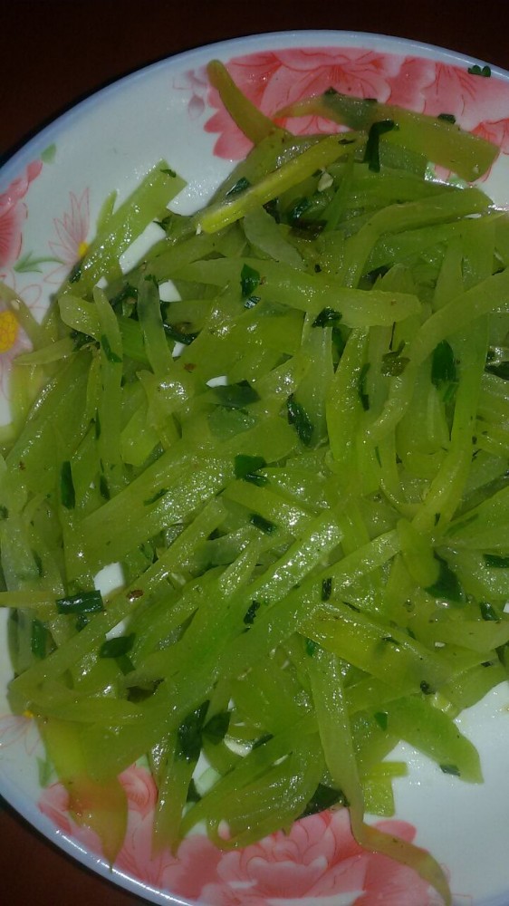 除了肉末豆腐这道菜以外,我还专门做了小不点喜欢吃的莴苣。其实,小不点和我以前都不太喜欢吃莴苣的,后来到邻居家吃过一次另一煮法的莴苣后我们就爱上了吃莴苣,基本上一周都会吃一两次的莴苣的。以前做 莴苣的时候,我一般是用它来炒肉的,而且切得比较大片,而朋友教我做的 莴苣是切条切丝的(俺刀功不好,所以切成条了),然后放开水里焯一下,然后再捞出来加些调料稍炒一下即可。虽然都是 莴苣,但由于做法不同了,所以口感也很不一样。用开水焯过再稍炒的 莴苣不但能保持其营养成分,而且吃起来特别的爽脆,深得我们一家人的喜爱。