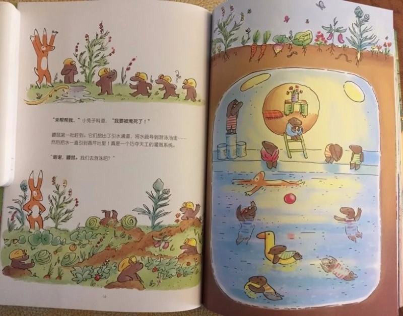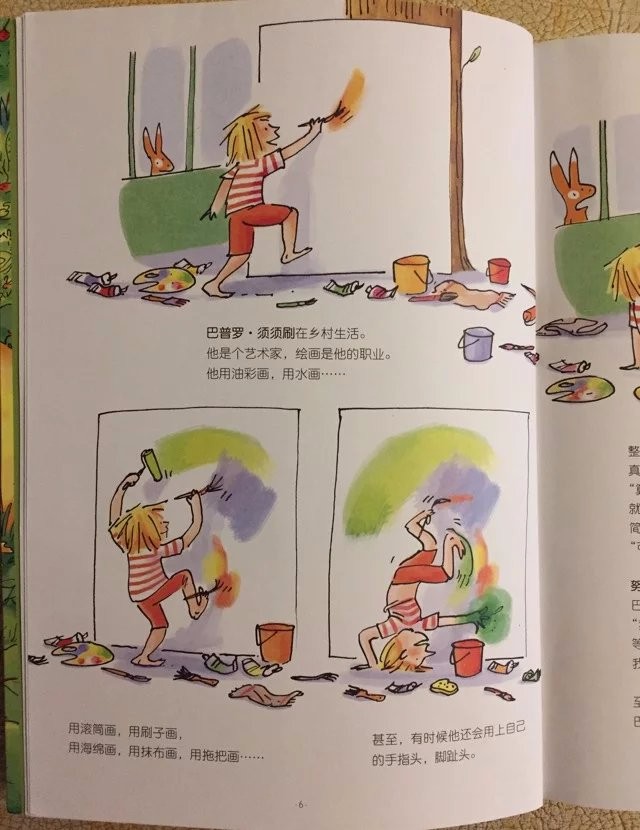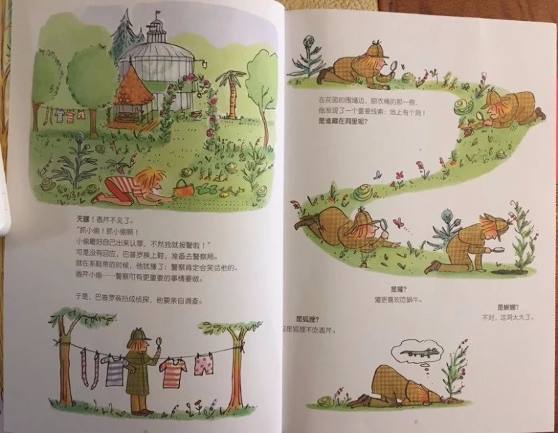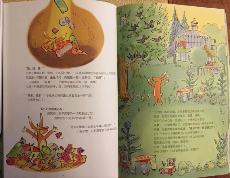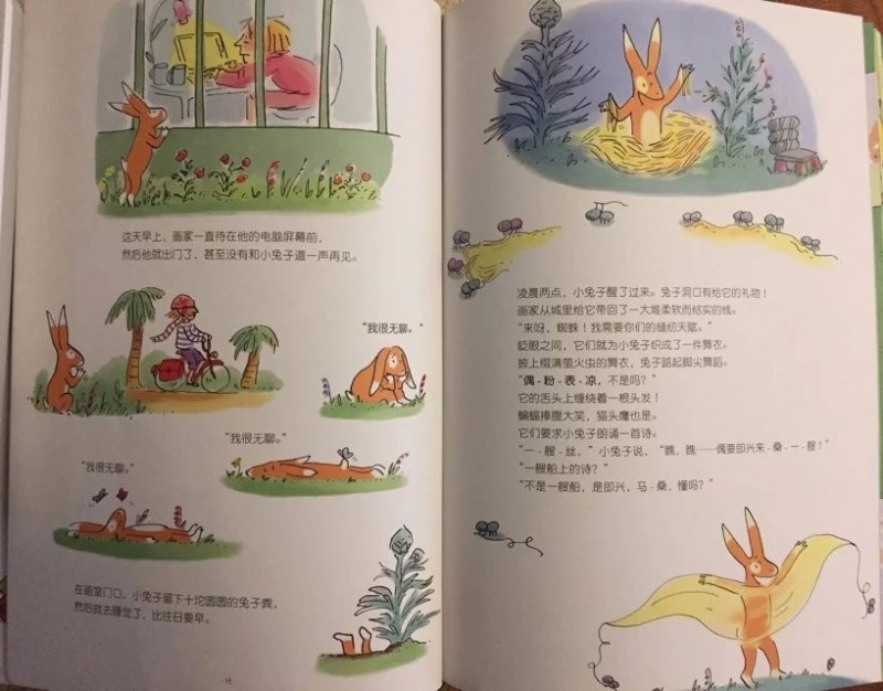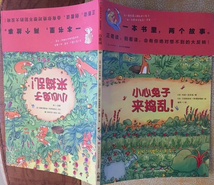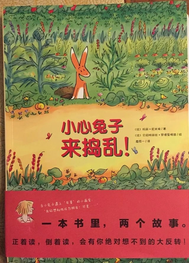 ——读《小心兔子来捣乱》 ![]() 兔子大概是我们接触的绘本和图画书里最常见、最经典的形象了。歪歪兔系列,小兔汤姆系列等等等等,都是我家宝贝的大爱。由此,小家伙也喜欢上了小兔子,无数次地央求我给他买只小兔子养。一看到这本《小心兔子来捣乱》封面上可爱的小兔子,小家伙就很有兴趣,自己翻看起来。 ![]() 看着看着,小家伙突然:“咦,书怎么变成倒的了?”我说你把书合上仔细观察下书的封面。小家伙一看:“好奇怪啊,这本书原来可以正着看也可以倒着看啊,是讲的两个故事吗?但是好像都是小兔子和小画家之间的故事啊,还是一个故事吧?”我告诉他人物是一样的,但是故事是不同的。小家伙直呼:好神奇的书啊!哈哈。 ![]() ![]() 这种图书设计模式确实是第一次接触,以前接触过这种类似设计的图书,不过那是两个完全不同的故事,等于是把两本书直接合订在了一起。跟这本书这种富有哲理的巧妙设计是没法相提并论的。 当我念出书名时,儿子很惊讶:“小兔子为什么会捣乱啊?兔子不是很乖的吗?”哈哈,是啊,我也想知道。 这本书的内容还是挺多的,和孩子一起仔细品读感受了一遍,花费了将近四十分钟的时间呢。期间小家伙也有点儿注意力不集中,不过当我模仿着书中人物的各种神情和动作时,惹得小家伙也哈哈大笑着跟我一起模仿,继续跟我一起慢慢品读。 其实,故事并不复杂,整本书讲述的都是小画家和小兔子之间让人忍俊不禁又引人深思的‘战争’和友谊。 正着读,是从小画家的视角出发。他眼中的小兔子是个偷吃他最爱的香芹菜的贼,一个嘲笑他、无数次挑衅他的恶魔。于是,一场报复之战开启。倒扣垃圾桶、水淹、撒辣椒粉、鞭炮、炸药、通电的铁丝网......小画家再也不是一个潜心作画的小艺术家,而是一个为了报复不择手段,被愤怒冲昏了头脑的‘恶魔’。 最终,他胜利了,兔子消失了。然而,他美丽的菜园也消失了。他终于可以安心作画了,但是他的画纸却总是一片空白。他再也找不到创作的灵感了,他甚至无心再做画了。 而倒着读,则是以兔子的视觉出发铺开的另外一个故事。小兔子为了躲避猎人误打误撞来到了小画家的花园。他非常喜欢这里,也非常崇拜小画家,想要和他做朋友。 然而,他的示好却成了小画家眼中的嘲弄和挑衅。而小画家对他展开的一连串的报复行为,在小兔子眼中却是他无微不至的关爱和友善。直到刺猬的提醒和亲眼目睹小画家疯狂的行为,小兔子才蓦然惊醒,他只好伤心地默默离开。 ![]() ![]() ![]() ![]() 真是美丽的误会啊!因为缺乏沟通和换位思考,本来都很善良的人却成了对方眼中的恶魔,彼此报复和伤害。还好,最终小兔子回到了小画家身边,他们成为了真正的朋友。 所谓一本书里两个故事,正着读,倒着读,会有意想不到的大反转!图书这种巧妙的设计正是在告诉我们一个人生哲理:看待事情一定要从不同的角度出发,不要轻易下结论。与人交往也好,育儿也好,都不能妄下断言,认定陌生人就一定是坏人,孩子都是调皮捣蛋的。 就拿我自己来说吧,我也经常误解孩子。现在想想其实很多时候,我们眼中孩子的调皮和捣蛋,只是好奇和想帮忙而已。只是他们太小了,沟通能力和动手能力都太差,所以才会被大人误解和责骂,只能委屈哭闹。而越是这样越容易火上浇油,大人和孩子之间的‘战争’和误会也会逐步升级。 记得儿子一岁左右的时候,有一次把大便拉在了地板上。在我还没发现的时候,小家伙自己拿着巨大的拖把想把大便拖干净,结果弄得屋里到处都是他的臭臭。可想而知,突然看到这种情形的我是多么生气,当时想都没想就大声地呵斥他,一边清洁一边忍不住打他屁股。事后我就后悔了:孩子这是想要帮忙啊,只是他太小了什么都不懂,不知道大便不能用拖把拖的。可是当时的我就像书中的小画家一样,只从自己的角度出发,一看到孩子把屋里弄得那么脏就来气。而反过来从孩子的角度看,其实孩子并没有错啊。 我们大人还经常犯这样的错误,更何况是心智尚不成熟的孩子们呢。所以,这本蕴含着深刻哲理的图画故事书,非常有必要和孩子一起细细品读! ![]() 除了引人深思的故事情节和巧妙的设计,喜欢这本书还有两大原因:一是其充满自然气息和艺术灵动感的画风,二是书中幽默搞笑的语言。 这本书给我的第一直觉就是画风太美了!仅仅是翻看一遍书中的图画已经是极大的艺术享受。 而书中小画家手脚并用,多种工具即兴发挥的作画风格,以及天马行空的想象力,还有极具艺术气息的玻璃房、充满自然气息的花园,无一不深深影响着认真阅读这本书的孩子们。在和孩子一起读书的时候,我有意让他认真体会书中的图画和意境,孩子也非常受用,相信一定会对他的绘画有所帮助! ![]() ![]() ![]() ![]() 书中的很多情节和文字也都让我们看得哈哈大笑。比如小画家穿上侦探服,拿着放大镜破案的情节;小画家用尿淹兔子洞、气愤地用垃圾桶罩住兔子洞,而小兔子还以为是小画家给他送来各种礼物的情节;还有小兔子披着头发舞衣跳舞的情节,都是极尽幽默和搞笑。 而两个故事对比着看,同样的事情,从小画家和小兔子各自不同的角度理解和反应,也是让人啼笑皆非。 ![]() ![]() ![]() 故事最后的画面充满爱和温暖。原来,多一份沟通,多一份理解和友爱,世界会变得如此美好!