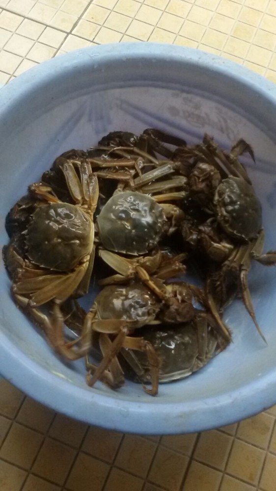 这些就是宝爸买的公蟹了,8只,共花了70元,比他在饭店里吃的25元一只的螃蟹实惠多了。我问他为什么不买母蟹,好多人都指定要母蟹呢?想不到他竟然说,公蟹便宜一些嘛。呵呵……宝爸这人太实在了。