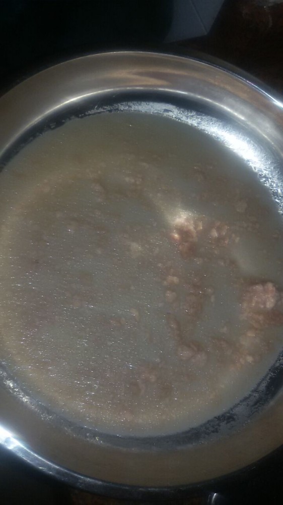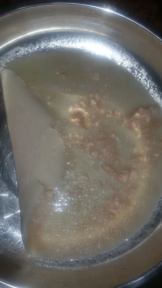 第一盘的时候,我只弄了三四勺到盘子里,可蒸出来后竟然刮不起,所以我就改放多一些月浆液了。结果发现蒸出来的肠粉一边太厚一边太薄,所以未能成功刮出一条像样的肠粉。思来想去,我觉得我们家这个浅盘不太适合用来做肠粉,因为它中间偏高一些,而且我们家的蒸架也是被宝爸弄得一边高一边低的,所以我蒸出来的肠粉是一边厚一边薄的,不成样子啊。