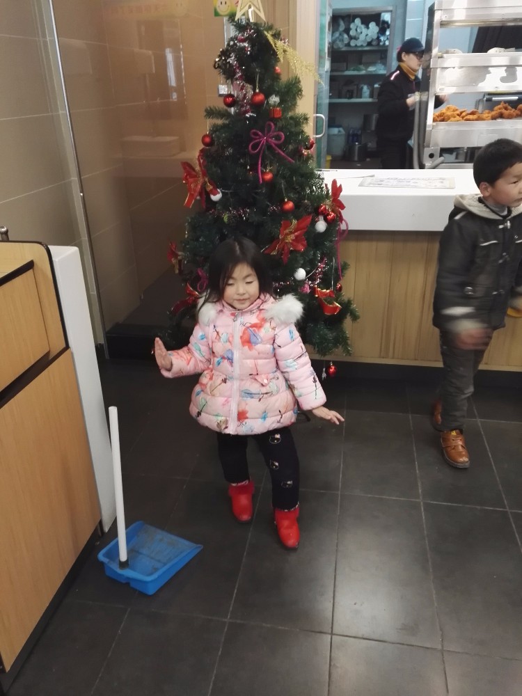 中午我们在家吃过饭后,就带她去母婴店洗澡,还好她这么大还是能洗的,在家洗怕她会感冒着凉了,在浴室洗又不方便。洗完澡后,她想去游乐场玩滑滑梯,不过今天玩的小朋友比较少,她就堆积木,玩滑滑梯,蹦蹦床,玩木马,爸爸会不时地向她扔个小球,她就和爸爸对打起来了,两个人玩的不亦乐乎。玩了很长时间后,她又想到玩游戏机了,爸爸也同意了,这么小居然喜欢玩游戏机,虽然是瞎玩的。我们小时候都没有这些东西玩的,长大后有的同学玩这个都被标上了荒废学业的标签,大家也就远离这些了。 爸爸说玩的累了带女儿去吃套餐,这对于女儿来说可是好消息,油炸的食品虽然不好可是小朋友喜欢吃啊,她还挺老练的,鸡排上挤一点番茄酱,慢慢的吃,再喝一口奶茶,倒是惬意的很。我看店里有棵圣诞树,给她拍了几张合影的照片。她还挺臭美的,还摆了几个不同的动作,还给我就介绍圣诞树上面的装饰品,没想到她的记忆好听好的,看过的书都还记得的。