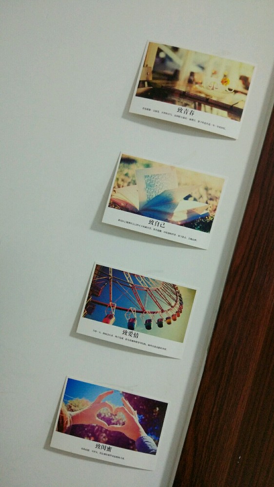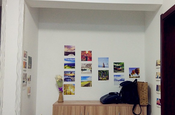 于是,我把去年的旧台历剪掉了。分开后的日历变成一张张很好看的卡片。找到之前珍藏的明信片,一起拿出来,比照着我们家空空的墙,似乎早应该添点什么。房子很大,房东只是简单的置办了基本的家具,家具又都是以前的,没有任何设计,只是按顺序摆放,方方正正,总显的有点生硬。边贴边想着,如果自己懂些设计就好了,贴卡片也不知道怎么贴更好看呢。