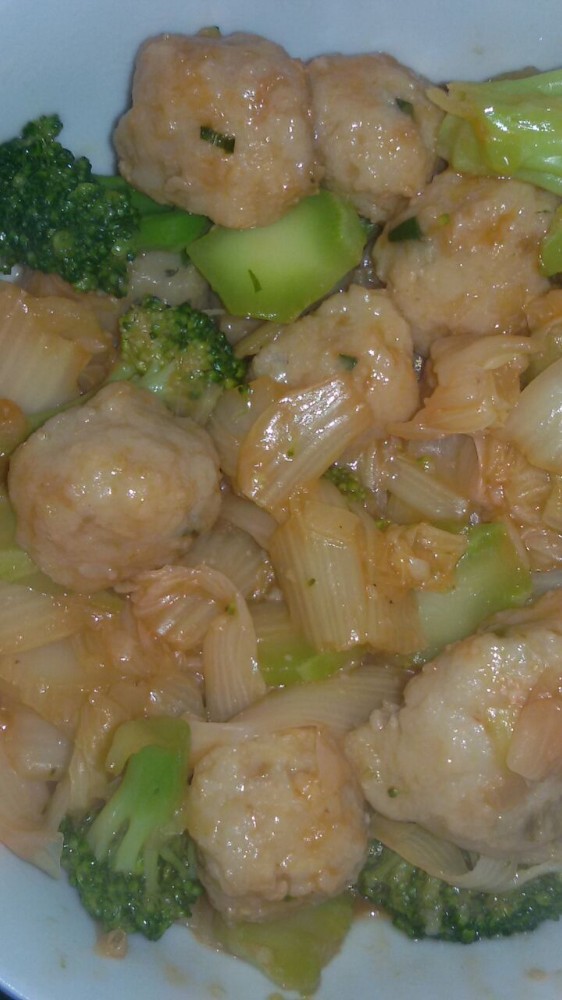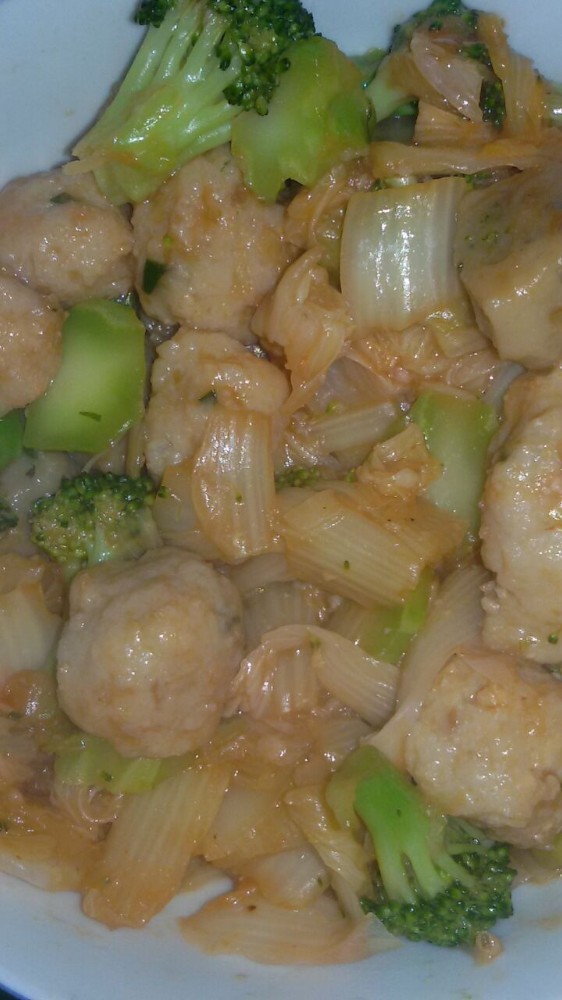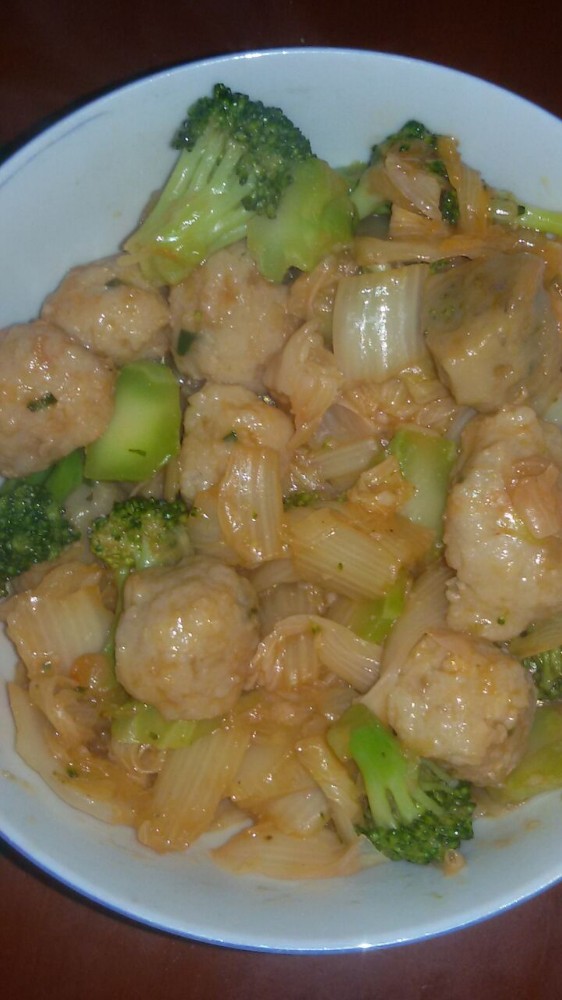 这是俺煮的杂菜焖肉丸,里面不但有猪肉丸,还有鱼肉丸。所谓的杂菜,包括了大白菜和西蓝花。考虑到小不点很喜欢吃西蓝花,可剩下的又不是很多,所以我懒得单独煮了,然后我就直接用它来焖肉丸了,虽然卖相不怎么好,但小家伙却不挑剔,仍然很喜欢吃这西蓝花。