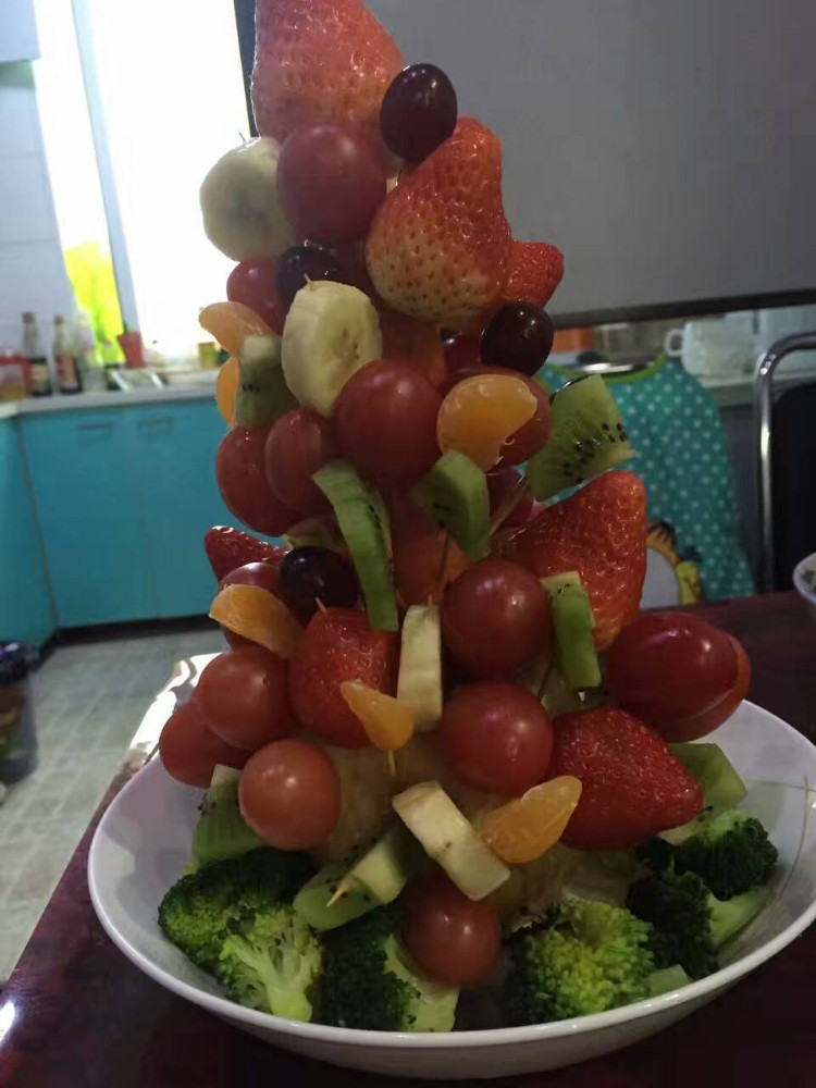 说完我们构思了很多种花样,最后我和宝贝决定做一棵圣诞树。主要工具很容易准备,水果和牙签就可以轻松搞定。在最里面我放了一个菠萝心,起到了圣诞树能保持直立的作用,然后插满牙签,把各种水果,比如情人果、橘子、香蕉、草莓、葡萄等等作为树叶,找牙签上的空位置一一插上去,插的越多越好,才能让我们看起来很丰富。摆盘的时候总感觉下面光秃秃的不好看,所以就在最下面铺了一层过水焯好的西兰花,这样有红,有绿,有黄,有橙,五颜六色看起来不仅好看而且也很有食欲。