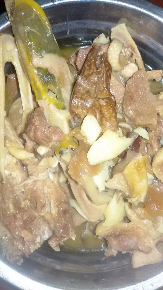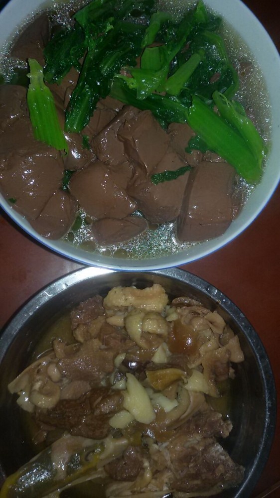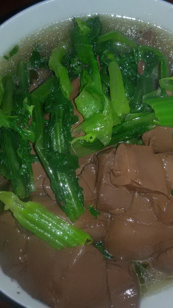 除了山药炖土鸭这道菜,宝爸还做了一个鸭血青菜汤,不过,我觉得鸭血的做法有点复杂,我不会做。听宝爸说,这鸭血得慢慢用小火浸熟它才行,不能心急。大家看得出这是什么蔬菜滚的鸭血汤吗?其实,它们是芥菜,是我父母种的,可好吃了,连连续几天没吃蔬菜的小不点也喜欢吃这种芥菜,当然还有鸭血。