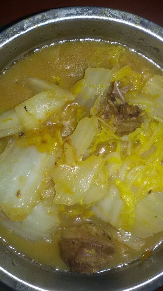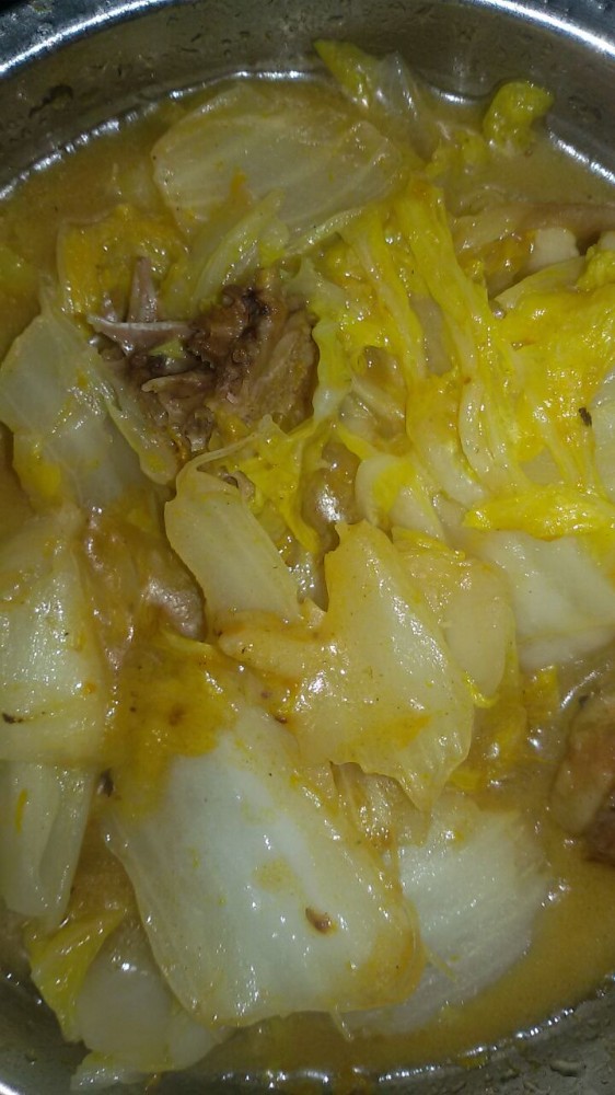 看,这就是俺煮的大白菜了,由于鸭肉那有鸭油,所以我一滴花生油也不加,只是用这鸭油来煮大白菜而已。虽然是这样,这煮出来的大白菜还是有一点点油腻的感觉,所以俺也没像平时那样吃很多这个大白菜。看来下次不能因为怕浪费鸭油,而选择把所有的鸭油都用来煮蔬菜的,这样很容易把蔬菜弄腻的。