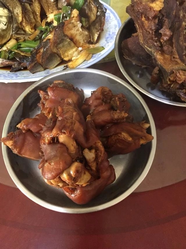 每到过年的时候,妈妈更是会做很多美食,水果甜汤、煎饼、黄焖鸡、卤肉、炸菜等等就连经常在饭店吃饭的老公也赞叹不绝。 腊月28那天,我们提前回家看望妈妈,妈妈又给我买们做了很多美食。有我小时候最爱吃的清蒸风干鱼,鱼是入冬后腌制了风干上的,能在常温下存放几个月,时间越久味道越好。吃的时候在水里泡泡洗一下,直接放高压锅清蒸。蒸熟后再热火煎炒些葱姜蒜,趁高温热浇到蒸好的鱼身上,趁热食用味道绝佳!这道菜的特点就是味道醇厚,肉质干香耐嚼,非常美味! ![]() 妈妈做的卤肉也是一绝,尤其是卤猪蹄,无论是颜色还是味道,比饭店卖的都要好很多呢! ![]()