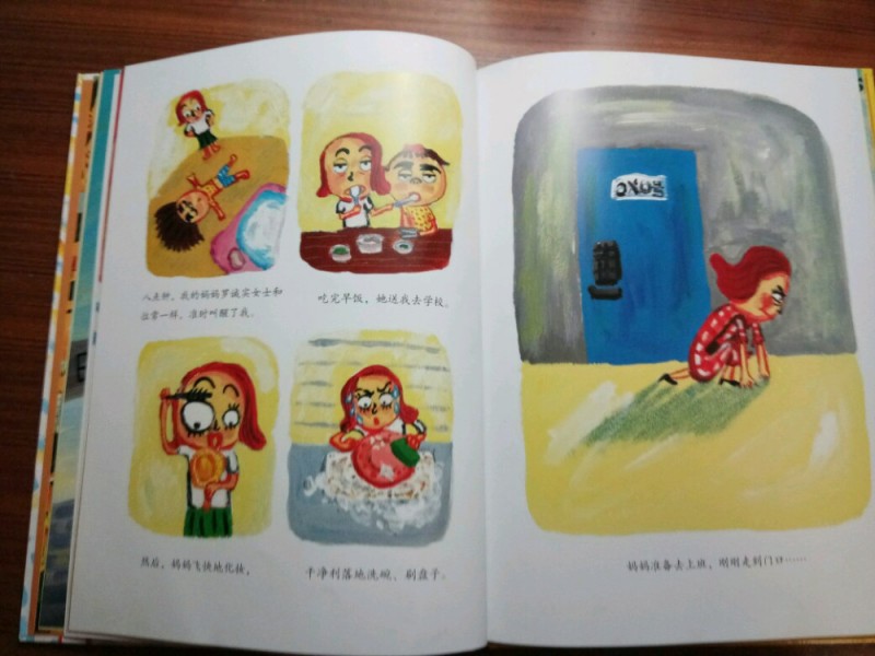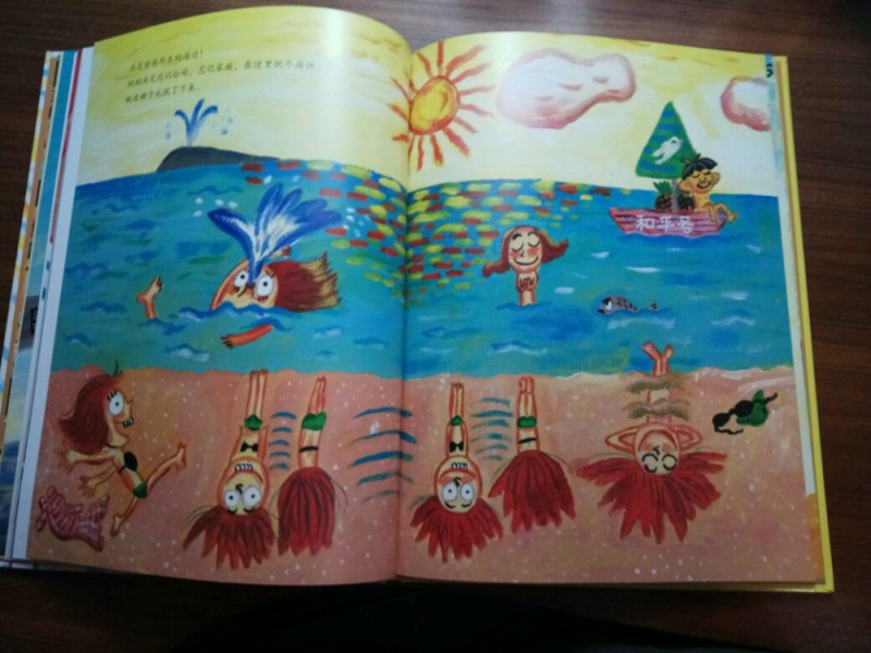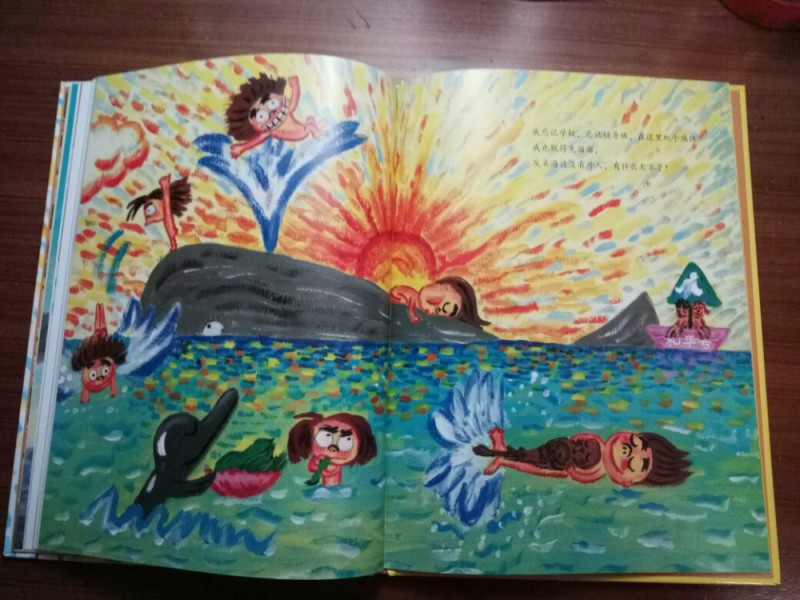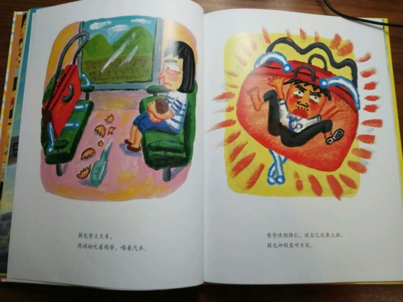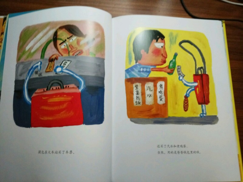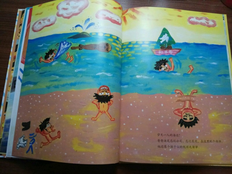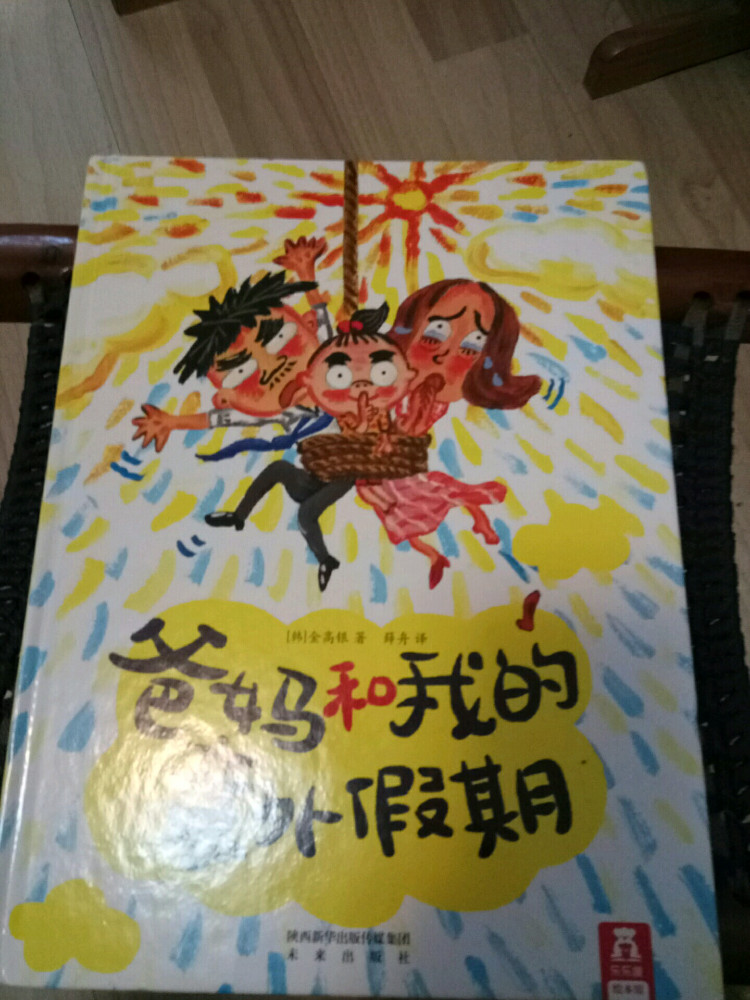 ![]() 《爸妈和我的意外假期》是由韩国作家金高银著、中国人薛舟翻译的一本绘本书。它是1月17日收到的,是一份临近小年送给我的意外礼物,更是送给刚刚考完试后要放寒假的儿子的意外大礼,它很是应景应心。 儿子捧着这本跟A4纸一样大小的硬壳纸板书,很是兴奋,表示”看书的名字和封面上的画,这一定是本很好玩很幽默的书!“。我让他先别打开书,只看着封面猜猜书里的内容。---------玩一把看画直觉感观小游戏。 儿子细细地看着封面,好一阵后,表示他的感觉有三点: 1、画面上是一家三口,爸爸妈妈和小女孩。他们全家都被绑架了,但是绑架他们的人不是坏人,因为只绑了他们的腰,没有绑着他们的手和腿。爸爸妈妈对这个绑架不开心,因为爸爸在反抗而妈妈都哭。但是,小女孩很高兴,她的眼睛都瞪的溜圆,还笑睐睐的。 2、他们被绑架的时候是夏天,因为他们分别穿着裙子和短袖衣服。 3、这个绑架的故事应该很好玩,因为画面颜色很漂亮,是亮亮的黄色让人感觉不害怕,而上面的画感觉像是我们小孩子画的一样,很夸张和搞怪,很像漫画,让人看了就感觉很好玩很开心。书的名字写的也很好玩,看起来字都像在跳舞一样。 儿子总结:他感觉这本书应该是一本讲爸爸妈妈和小女孩不小心被别人绑错了架,变成了意外假期的搞笑漫画书。------很欣慰,儿子猜的虽不算中但也算是很靠谱了。骄傲!儿子的想象力还是很具有一定发展空间和潜力的嘛! ![]() 猜想完封面,我们开始打开绘本,逐页翻阅,让他自己来领略故事内容。读法还是如法炮制,先看画面自行猜想画面内容,讲述自己臆想故事后,再来读相关文字介绍。然后再对照文字细看画面,最后全书一起通读一遍。 如此,在一猜二看三通读的阅读下,粗粗看来简单的绘本画面就像在显微镜下抽丝剥茧般,变得处处细节林立,擘肌分理了。 钱 儿子指着画面上拥挤的人群里大多数呆板无神的眼睛,特别是人群中一位站立着闭着眼睛只管睡并睡出大大的鼻涕泡泡的仁兄,乐的哈哈大笑,并深深地表示同情及同感:他自己每天起床上学时,也是有睡不够瞪不起眼的感觉!他每每坐在我的电动车后座上都要闭着眼再睐一睐,原来上班和上学一样,都很辛苦的!并指出,原来韩国人也跟中国一样,都爱看手机(因为这一画面里那么拥挤的人群里就有6个人在看手机,而只有2个人在看书,并且其中1人边看边流泪。儿子对此很是坚定认为这位女士肯定是跟皓妈我一样看的是小说.......... --------得!一个画面推断出二个结论:1、原来本人一直在儿子心目中是这样一个失败的黑色的形象(爱看小说,且爱边看边流泪)。2、所谓的手机党或低头族不光是中国特色,更是全世界共同的问题了。 ![]() ![]() 儿子盯着画面上吃饱喝足并且丢了一地垃圾的红提包,很是好奇:这提包吃的东西是不是都落到了爸爸的肚子里?对面的阿姨看到独自吃东西的提包,只是吓的抱着自己的包盯着提包看,并且爸爸在提包里使劲挣扎和喊叫,提包左摇右晃那她为什么不报警呢?还有火车站售票和卖东西给提包的两个叔叔也是一样,他们看到这样自己坐车买票买东西的提包,都吃惊的皱眉张嘴和挑眉吸嘴,但是都没有拦着提包问一问或直接捉住提包!儿子表示:如果让他看到这样的提包,他肯定是要拦住或捉住的,最少也要好好问问提包的,好不容易遇到一个魔法包必须要好好看看清楚才行! -----------社会生存的压力,让人们只顾着自己和自己家的一亩三分地了。人们对美好未来生活的巨大渴望,使人们只关注于自己眼前能挣到钱,根本无心去管钱的来源和出处,更丧失了人与人之间守望相助的热情和人性。 ![]() ![]() ![]() 关于妈妈的旅行方式,更是搞笑和创意-------妈妈出门前穿上身的花裙子直接反转,把妈妈上半身包裹成邮包直升飞机,直接降落到了爸爸所在的海边。 ![]() ![]() ![]() 而书的小主人公----我,钱真海,出行的方式可比较悲惨。在学校里正跟全世界最难数学做斗争的时,下课呤声让充满了密密麻麻的数字和符号的大脑袋像泄气的气球一样,一路撒着各种数学和符号,最后也掉落在爸爸妈妈所在的海边。 ![]() ![]() ![]() ![]() 一家三口在海边胜利会师了。于是,他们三人都脱的光溜溜,在海里和动物们自由地、尽情地、亲密地嬉戏玩耍,很是开心。可是,人玩的再开心再久,也还是有基本的生存需要呀,比如吃饭和睡觉。而爸爸妈妈的飞行工具------提包裙子很是厉害。他们虽然不打招呼就把爸爸妈妈赤手空拳带了来,到了吃饭睡觉时间时,他们又变身了,分别跑到海里和山林里,抓来了一包鱼儿、一兜水果,最后,裙子又化身成了大睡单,一家三口美美地躺在裙子上呼呼大睡。公司、学校、家,统统都忘掉--------幸福生活就在当下! ![]() ![]() 儿子于绘本的细节推敲翻阅中,在哈哈大笑的幽默漫画中,品读出了上班人群的拥挤和疲惫,品读出了人群中的自顾自的忙碌和冷漠,更从中读到了大人也跟孩子一样”脱的光溜溜地“渴望着自由,大人也想着远离束缚和忙碌,开开心心地轻松地玩乐。 ![]() 其中,儿子对书中小主人公的遭遇很是同情和羡慕。儿子啧啧有声的感叹和抱怨,“这头脑也是没有治了,还能像气球一样撒气呀!我每天上学小学,做题做作业,脑袋里不光是数字还有汉字和英语字母呢,比她还多还有感觉象爆炸呢,怎么就没有像她一样遇到这样好的事呀?” 是呀,我怎么也没有遇到这种“绑架”