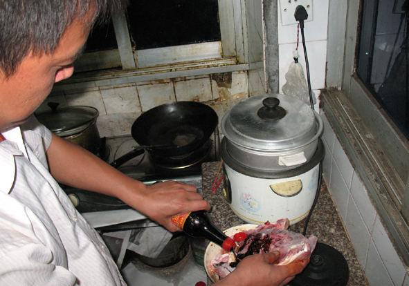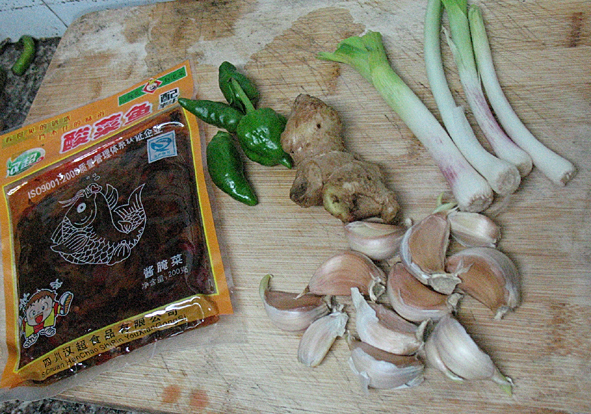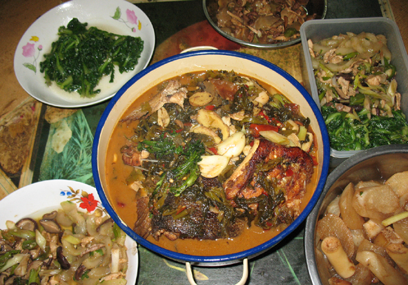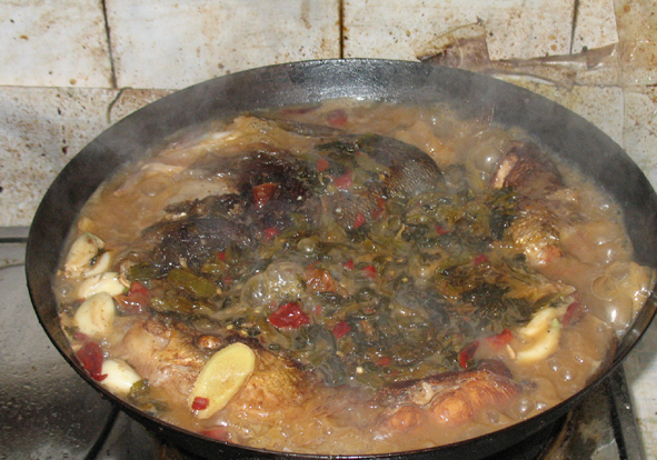 呵呵!来参加美食板块的活动了哦 !因为我不会做饭啊,所以啊!很难得才来参加的哟 !这次可是由老公亲自下厨的哟!他作的鱼味道还真是不错的呢! 准备的食材就是:新鲜的鱼头,这可是鄱阳湖里面真正的没有污染的大雄鱼哟!味道就是不一样啊!还有酸菜、辣椒、大蒜、生姜、新鲜大蒜等........... 乘着老公给鱼头上色,赶紧来拍照哦!呵呵!也不知道老公从哪里学来的啦!他也很少下厨房的,吃惯了现成的哟!先给鱼头涂上酱,这样颜色就会比较漂亮啊!看着也比较有食欲呢! 涂抹好了酱油后,就下锅煎一下,这样鱼肉就不容易散落哦! 煎的差不多就可以加入开水了!看啊!满满的一大锅哟 !这个汤可是很好喝的呢!所以要多加一些嘛! 让水烧开了,加入佐料,具体的就是油盐酱醋拉 !呵呵 !然后再继续烧,加酸菜进去哦!看着锅子里面的鱼头“咕嘟咕嘟”的冒着热气,快要成功了哦! 最后起锅之前再加入一些香菜哦!碧绿的颜色,特殊的香气,使得这酸菜鱼头汤更加的诱人呀! 最后上桌了哦!,还不错吧!那颜色看的很漂亮啊!赶紧尝一口哦!哈哈 !好吃啊!真的哦! 加上中午的菜一起合个影了哦!哈哈 !这次的酸菜鱼头很好吃哟 !