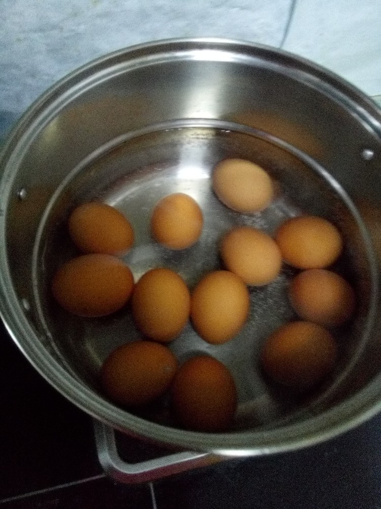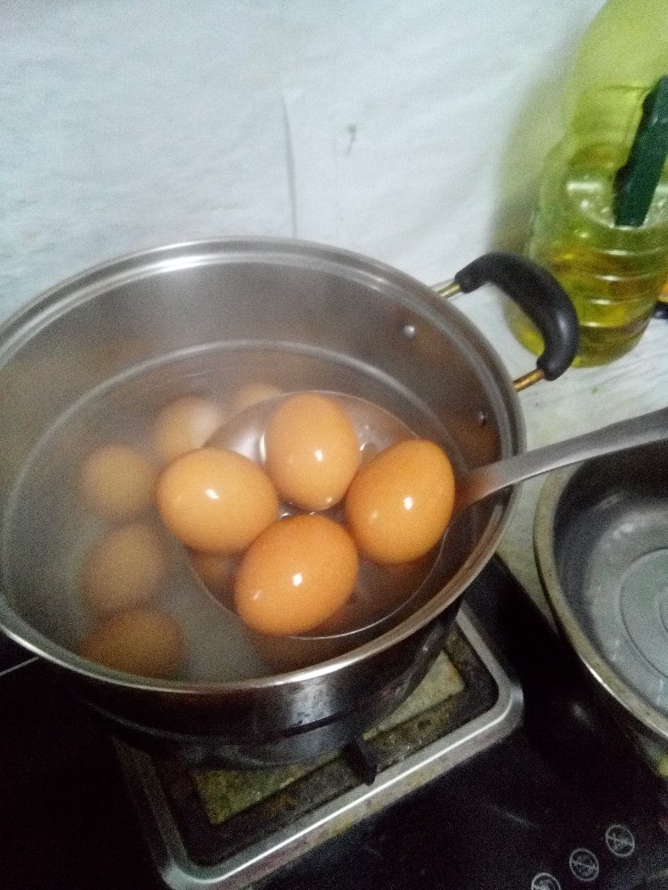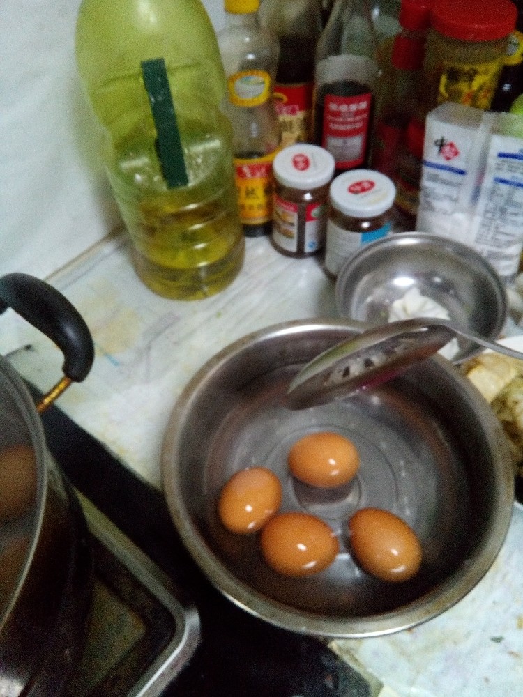 很早的时候就听说卤蛋能自己做,而且做法简单,孩子特别爱吃。昨天下午的时候,刚好宝宝跟着婆婆出去买东西,趁着这个空隙,上网搜索了一下做法,看着非常简单,我检查了一下家里的材料,缺一个生抽。我先把鸡蛋洗干净,然后冷水锅里放进去,开火煮,等水开了以后,大概又过了五分钟,我把火关了。其实这个过程不用这么久,只要保证蛋黄凝固就可以,因为后面还要煮的,所以不用担心鸡蛋不够熟。