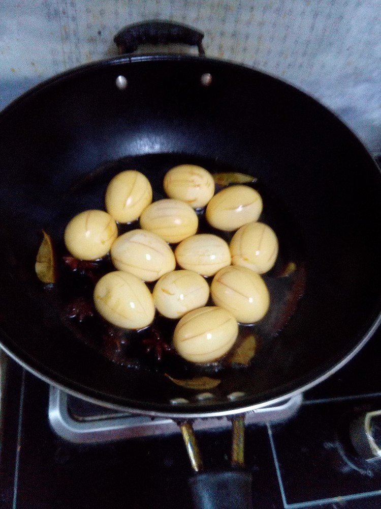 准备一盆凉水,把热锅里 的鸡蛋用漏勺捞出来,直接放到凉水盆里,据说热鸡蛋到凉水里蛋壳会好剥很多,我用了这个方法,确实还不错。趁着鸡蛋冷凉的过程,我下楼买了一瓶生抽回来,接着开始剥鸡蛋,先把鸡蛋都去壳,然后拿刀在每一个鸡蛋上划几刀,我都是划得很多刀,这样比较容易入味,鸡蛋放在炒菜锅里煮,加水到鸡蛋的一半高度就可以了,然后按照做法把香叶、八角、生抽、老抽都倒进去,加入盐和白糖。调料都放进去以后,让鸡蛋在混合的调料水里滚来滚去,均匀的沾满了调料,开火煮,煮一会就要让鸡蛋翻滚几次,这样味道会比较均匀。