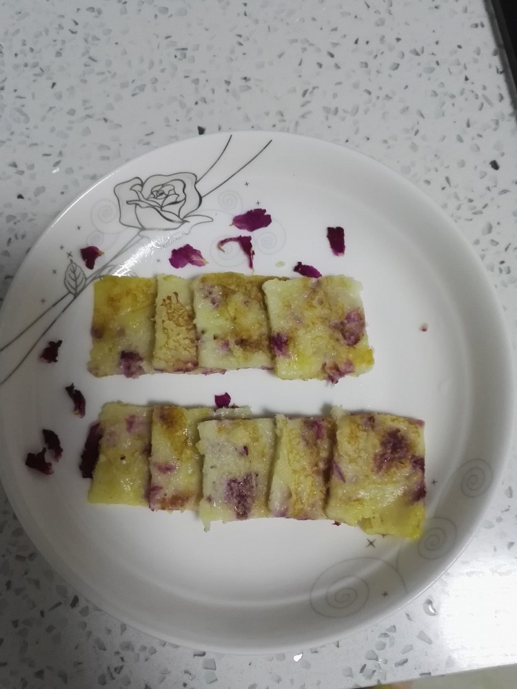 玫瑰花是爱情的象征,可供观赏,由于它本身的药用价值,现在被制成精油,芳香剂,当然也是吃货的福利,玫瑰花好看,药用价值高,平常也能吃,美容效果甚佳,能有效地清除自由基,消除色素沉着,令人唤发青春活力,爱美的美眉们是不是很心动。花茶是不错的选择,可是天天喝玫瑰花茶也没劲,还可以煮粥的,我今天要尝试的是做饼子,也是参照网络上的食谱。 首先准备原材料,玫瑰花瓣,白糖,纯牛奶,面粉,也可以加水,用纯牛奶的话营养比较丰富,而且口感会细腻一点。 ![]() 因为是第一次做,我就弄了3把面粉,加了一勺白糖,加入适量牛奶,搅拌均匀,可以分次倒入牛奶,直到成为流动的面糊即可,最后凭喜好加入玫瑰花。 ![]() 最好用不粘锅,在锅底刷一层油,家里只有菜籽油,发现颜色太明显,最好还是选择色拉油,将面糊倒入锅里铺平,小火煎一会儿至凝固就可以翻过来煎一会儿,即可出锅了。 ![]() 可以用刀或磨具切成喜欢的样式,看起来还不错吧,下次记得换上色拉油。这很简单,我是小白也能做出来哦,真的很好吃,玫瑰花饼软糯细腻,奶香中夹杂着淡淡的玫瑰花香,边看电视边吃很惬意呢,只是我的还夹杂着菜油的香,哈哈。