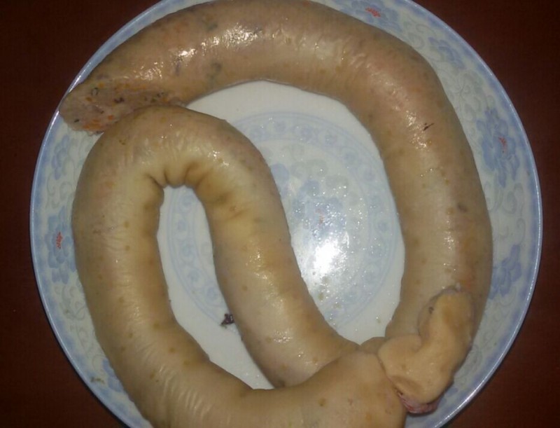 酿大肠的馅料弄好以后,接下来宝爸就准备处理大肠了。话说大肠不但有股骚味,而且里面的油比较多,所以宝爸得把肠子里面的油都弄掉,然后用生粉和食盐把肠子清洗干净,接着再把大肠放到开水里焯一下,这样肠子就算处理好了。 大肠处理好以后,下面就是把馅料灌到大肠里面,然后宝爸叫我找那个平时用来灌油的漏斗出来,我听了就说漏斗嘴太小了,不适合用,然后我就找了一个空矿泉水瓶,然后取了瓶子上部分作为灌肠的漏斗。弄好这个简单的工具后,宝爸又让我找来一些棉线,然后我就找了一些从米袋上拆下来的棉线。 接下来,宝爸就负责把馅料都灌到大肠里面,而我则负责把大肠的头和尾绑紧。灌完肠后宝爸就开始把它们放到锅里煮,酿肠煮熟后把棉线拆开看,它们就是下面这个样子了。