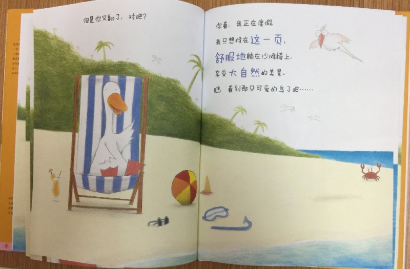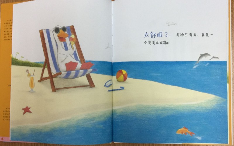 鸭子的假期是我参加第302期分享的时候很幸运得到的一本绘本,对于假期每一个人都是很喜欢的,特别是对于上班族的我们和上学的孩子来说,更加的期盼能够有一场自己的假期,然后做自己想做的事情,而这一本鸭子的假期就是一本关于假期的绘本,而且还是一本精装绘本,对于精装绘本,大家都是比较熟悉的,精装的书大部分对于纸张的要求是十分高的,而且拿起来的档次也会比较显得有档次一点,并且这还是一本大开本的绘本。
