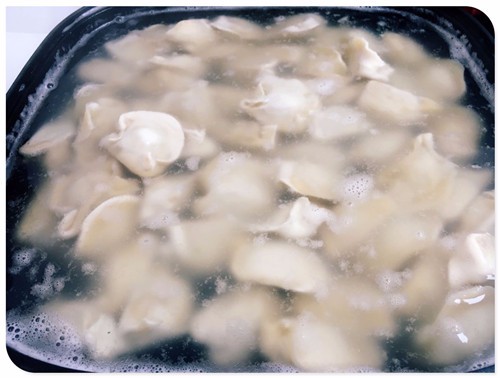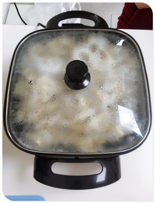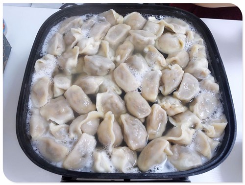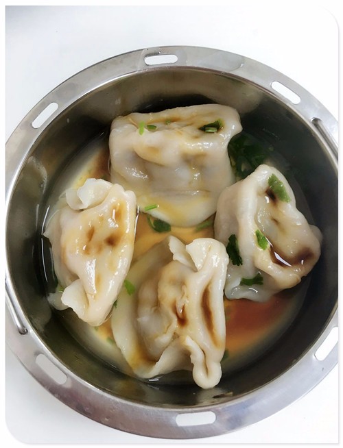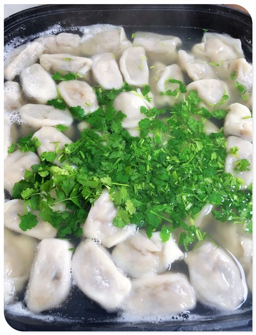 由于我们都不会包饺子,为了解馋,只能到超市买的现成速冻饺子,还额外送了一包高汤料包。速冻饺子分为几个不同口味,有芹菜馅、白菜馅、三鲜馅、玉米馅。我们买的是三鲜馅,这是比较大众化的口味,而平时如果是买回家里吃的,我更喜欢玉米馅的,主要是孩子也喜欢吃这个口味的。考虑到同事算下来也有十来个人,所以我们买的是这种大包装两层的,这样确保让每个同事都能分享到。另外考虑到是煮水饺汤,我们仨又另外各打包了两份炒白果用以搭配。 中午一下班,我们开始烧水下高汤料包,准备煮饺子了。看这一锅汤水煮得那叫一个热滚滚啊! ![]() 水烧开后就可以依次下饺子了,排排站,一个一个扑通跳下去,捞去浮沫,盖上锅盖焖着煮。中间要注意用勺子稍微搅动一番,防止粘锅。 ![]() ![]() 待到水饺开始陆续浮上来后,关火,也就可以开吃了 ![]() 我从家里带了些香菜,切碎后放进饺子里,这鲜绿的颜色让饺子看上去更可口也更有食欲了。 ![]() 沾点酱油、醋等调料,美味的饺子就可以好好享用啦