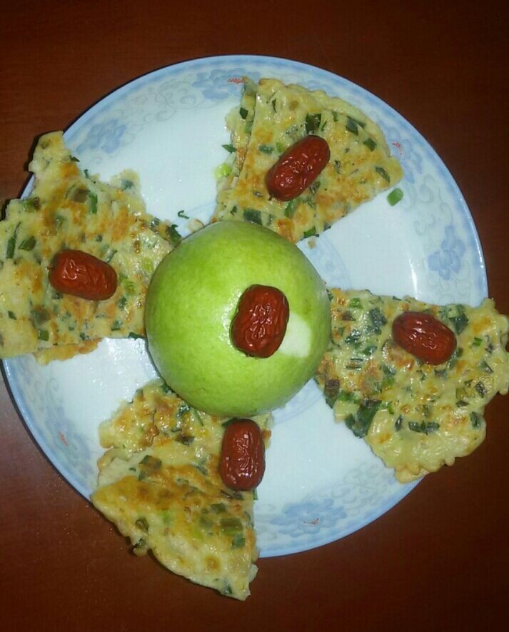 考虑到这么大张的煎饼不太好拿,所以我就建议把煎饼都切小块,然后再配上水果和红枣一起吃,然后小家伙就抢着自己摆造型了。看,下面这个就是小不点自己摆的造型了,看着还可以吧。