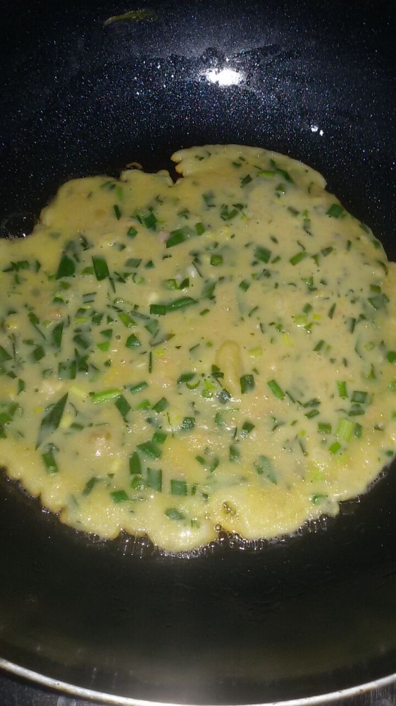 看搅和得差不多了,我就告诉小不点妈妈还要往里面加些食盐,他听到后就说让他来,然后我就把食盐的分量弄好,然后让他把食盐放到煎饼液里继续搅拌。准备工作做好以后,我就开始做煎饼了。 看,这些就是刚下锅的煎饼液了,里面有鸡蛋(1只)、韭菜末、土豆泥、猪肉末、葱末,当然还有食盐和面粉。需要注意的是,做煎饼的时候最好用不粘锅,这样不但可以省油,而且煎饼不容易煎糊。