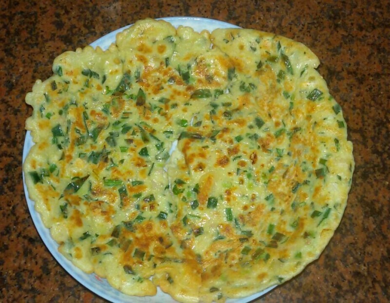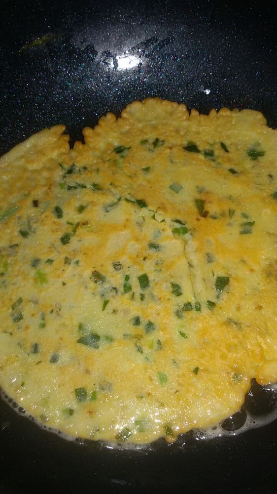 看到锅里的煎饼已经煎得差不多,而且一大块的样子,小不点就叮嘱妈妈千万别把煎饼下弄小了,他喜欢大张的煎饼。虽然我当时已经答应小不点了,但想不到后来煎饼煎过头了,然后一大张的煎饼就一分为二了,然后我只好分两次把它们盛到菜盘里。看,下面这盘就是俺做的煎饼了,里面也有小不点的功劳哦。