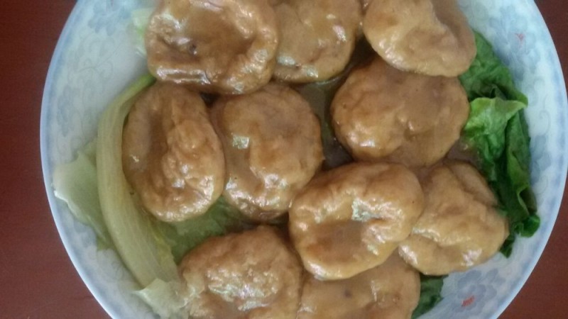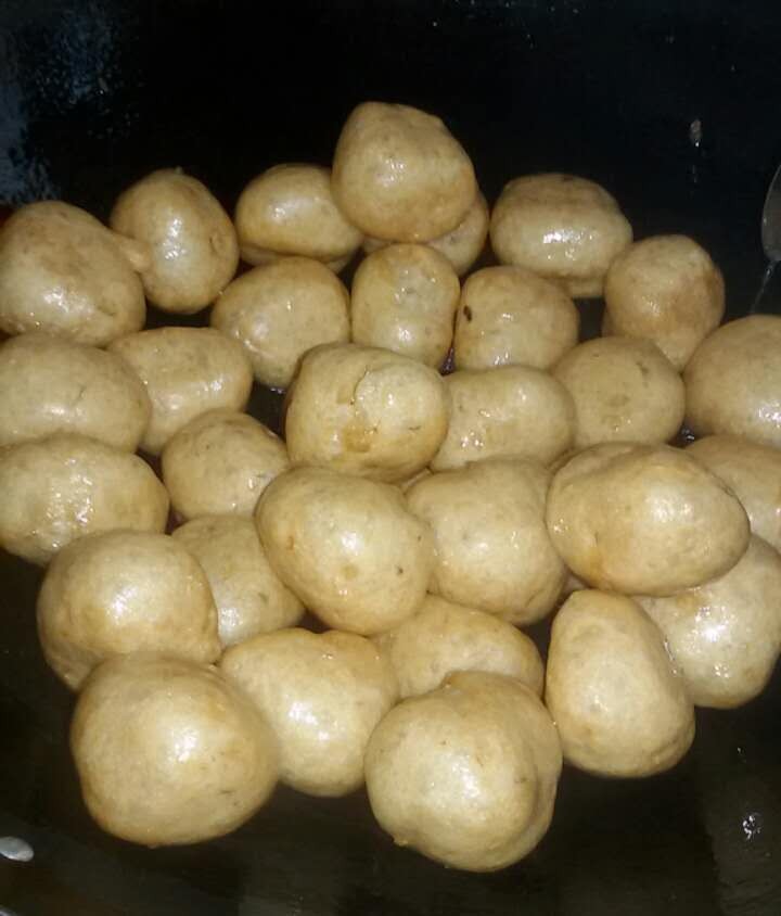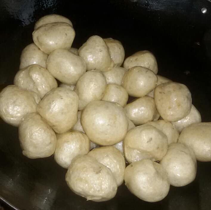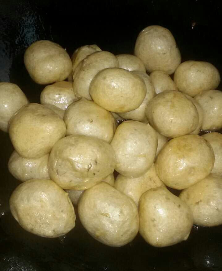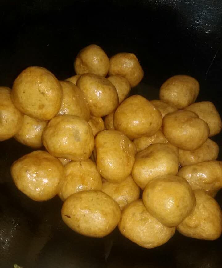 看着锅里的这些鱼腐,未吃过鱼腐的人可能以为它们是全部用面粉做的小吃吧,其实不是的,它主要是用鱼肉、鸡蛋、生粉等材料制成,然后放油锅里炸熟而成。这些鱼腐可是我们这边的特色美食,而且价格不便宜的,是喜庆日子和宴席上缺不可少的一道美食,春节的时候基本上家家户户都会用它来招待客人的。