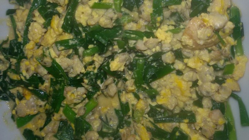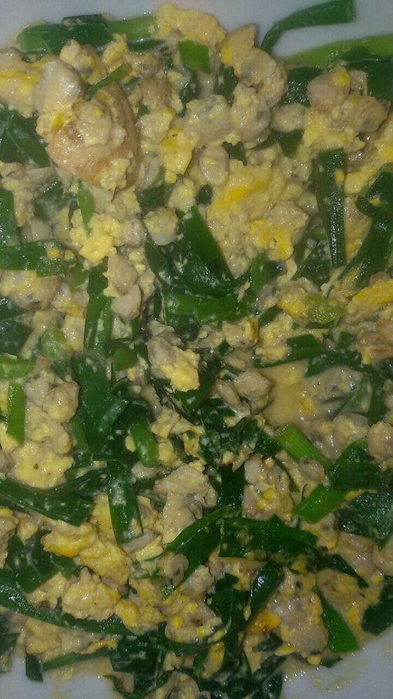 看,这就是我煮好的蚬肉韭菜鸡蛋了,看着还不错吧,虽然卖相是差了点,鸡蛋黄看上去也不完整,但这道菜却很受我们母子俩的欢迎,很合我们的胃口,蚬肉特别的清甜,配着韭菜和鸡蛋黄吃特别的香,令人越吃越想吃,所以不一会儿我们就把它吃光光了。