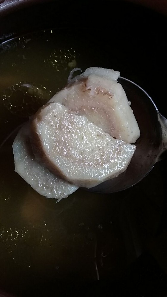我本打算把这两条粉葛都放到锅里煲鸡汤的,可由于锅太小,放不下,所以只好放切过的那条粉葛下去煲汤了。虽然这粉葛鸡汤看上去比较油腻,但由于是土鸡来的,加上粉葛会吸油,所以这汤总体来讲,还是蛮好喝的,而且非常的清甜。下面跟大家简单讲一下这粉葛鸡汤的做法。 材料准备:粉葛一条(约250克)、土鸡600克、生姜三片、蜜枣两只 步骤: 1、土鸡洗净,斩块,然后放开水中焯一下水(目的是去杂质和血水),备用; 2、粉葛洗净,削去皮,然后再清洗一遍,然后切块,备用; 3、生姜、蜜枣洗净备用; 4、把上述所有材料一同放入砂锅内,一次性加足水大火煮,水开后改小火煲两个小时; 5、调入适量的食盐和胡椒粉,然后关火; 6、饮汤食肉和粉葛。