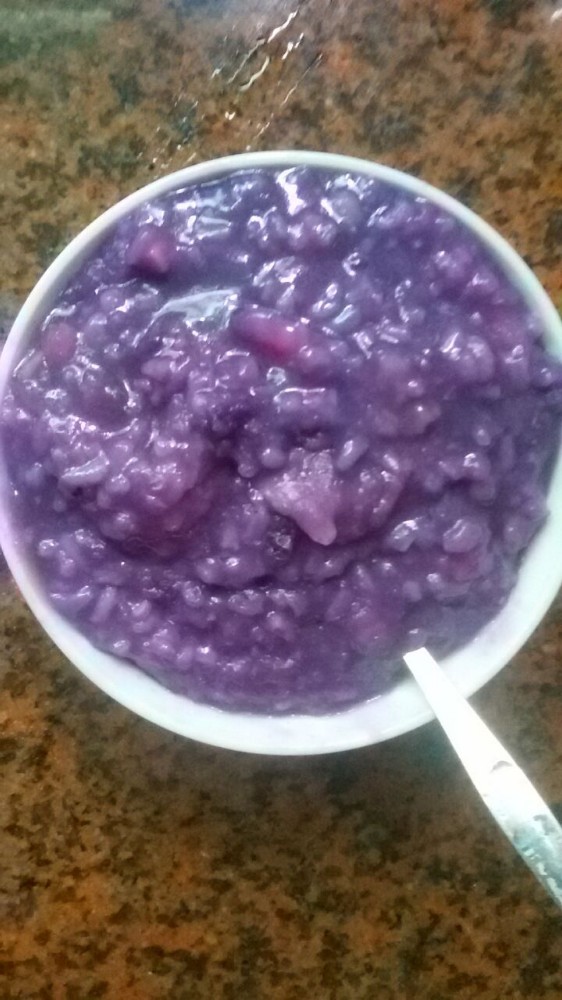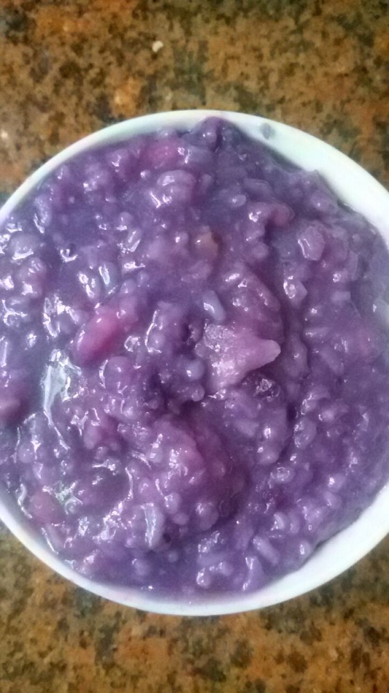 看,这就是宝爸煮的大肉薯粥了,里面除了大米就是大肉薯了。虽然这做法非常的简单(只需要把大肉薯拍成细末,然后与大米一起煮成粥),但这紫色的大肉薯大米粥却是非常的美味,令人越吃越想吃呢。