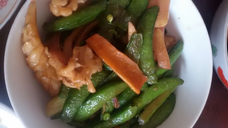 大家看得出这是什么菜吗?其实它是甜豆炒鱿鱼。一般来讲,鱿鱼都是用来炒芹菜或者炒荷兰豆的,后来听说家里只有甜豆,所以就只好用甜豆来代替荷兰豆了,虽然这种做法比较特别,但个人更喜欢吃甜豆,因为它吃起来有股甜甜的味道,而且甜而不腻,好像很开胃的样子。不过,鱿鱼的那股味道我是不太喜欢闻的,所以这道菜我也没多吃,只是吃了些甜豆而已。