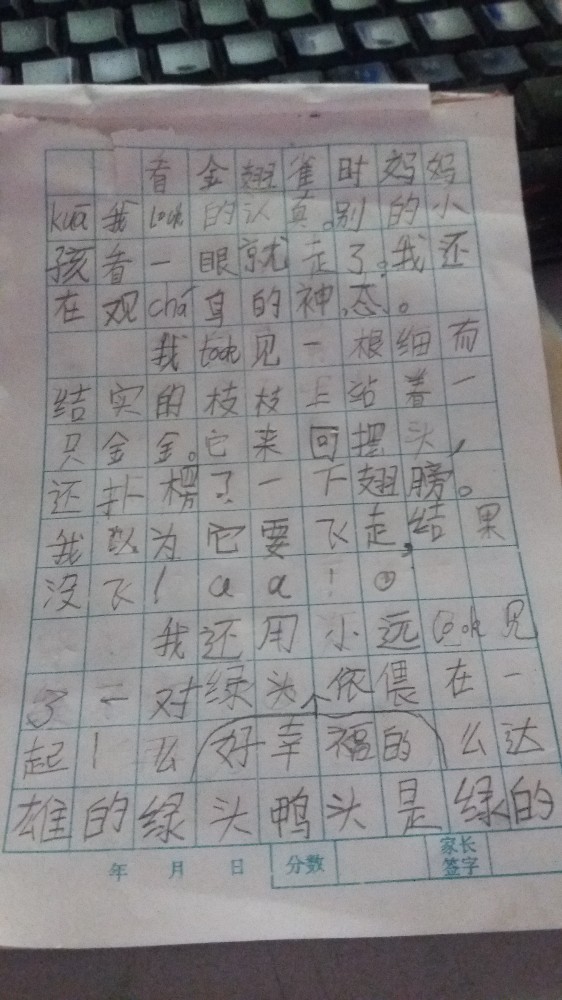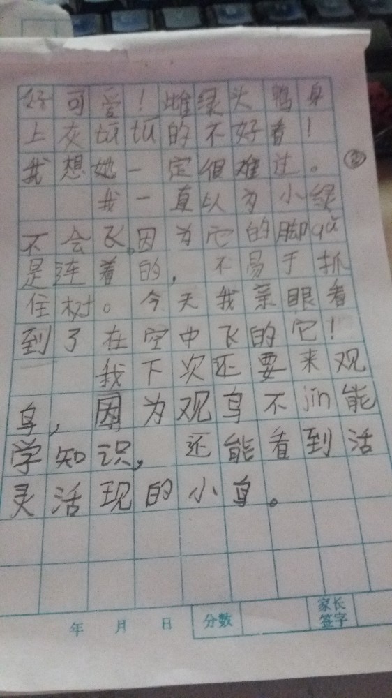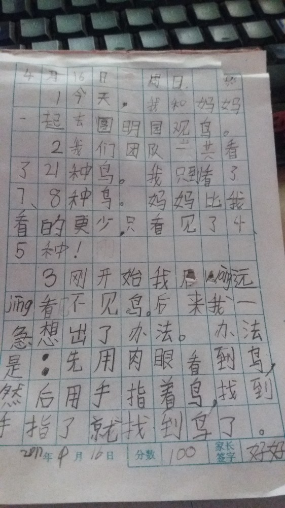 今天,我和妈妈一起去圆明园观鸟。 我们团队一共看了21种鸟。我只看到了7、8种鸟。妈妈比我看的更少,只看见了4.5种! ![]() 刚开始,我用望远镜看不见鸟。后来我一急想出了办法:先用肉眼看到鸟,然后用手指着鸟,找到手指了,就找到鸟了。 看金翅雀时,妈妈夸我LOOK的认真。别的小孩看一眼就走了,我还在观察鸟的神态。 ![]() 我LOOK一根细而结实的树枝上站着一只金金。它来回摆头,扑棱了一下翅膀。我以为它要飞走,结果没飞。 我还用小远LOOK了一对绿头,好幸福的依偎在一起,么么哒!雄的绿头鸭头是绿的!好可爱!雌绿头鸭身上灰突突的,不好看!我想它一定很难过。 ![]() 我一直以为小绿不会飞。因为它的脚蹼是连着的,不易于抓住树。今天,我亲眼看到了在空中飞的它! ![]() 我下次还要来观鸟。因为观鸟不仅能学知识,还能看到活灵活现的小鸟。 本作品未经作者许可不得转载,转载请征求作者意见。擅自转载使用,将保留追究其法律责任的权利! 评分记录