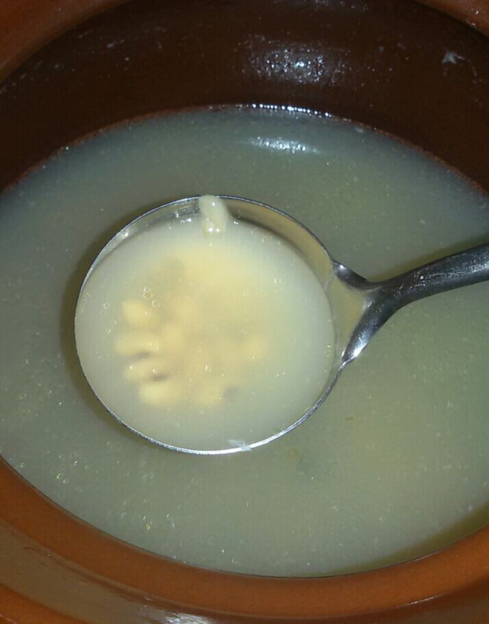 因为黄豆是比较难煮软的,所以在煲汤之前得先用清水把黄豆泡软,然后把杂质挑出来,然后再用它来煲鱼头汤。鱼虽然是自家山泉水养的,鱼头没什么腥味,但为了使鱼头汤更好喝,我还是决定用油先把鱼头煎香,然后再和黄豆一起煲汤。 看,下面这锅这就是我花了一个半小时左右煲的鱼头黄豆汤了,看着虽然不怎么样,但汤还是蛮好喝的,我们都很喜欢喝。