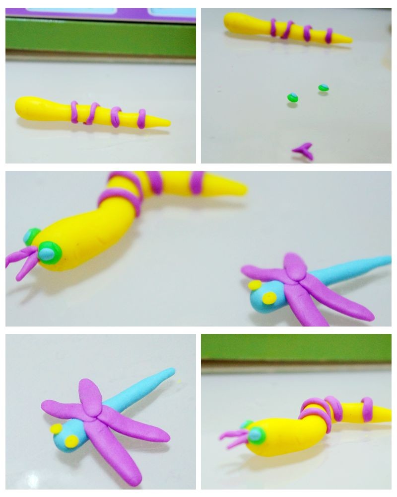 第二个场景是小蛇和蜻蜓,制作这两个的时候多宝玩high了,也让我体会到了培乐多彩泥的各种优点,不粘手,无异味,不软踏,成形效果好,颜色也够靓丽,每个颜色都非常正,加上多宝对于颜色的把握也比较好,所以搭配出来的成品效果非常赞!