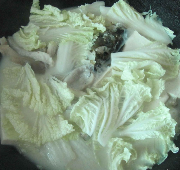 再放入豆腐、香菇和白菜等辅料,放入盐、味精,黄酒,随后要开大火咕嘟,咕嘟。三五分钟之后汤就开始慢慢变白,再继续大火煮五分钟左右,换成中火继续炖个5到10分钟,在要临出锅前,撒上一点点的葱花就大功告成了。是不是很简单呢。